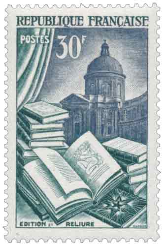 | Commentaire | Émis en France en 1954, le timbre-poste gommé de la série des productions françaises de luxe consacré à l’Édition et la Reliure illustre l’importance culturelle et économique du livre dans l’histoire nationale, en mettant en valeur à la fois l’art typographique et le savoir-faire artisanal de la reliure, deux activités étroitement liées au rayonnement intellectuel français. Mis en vente à Paris le 6 mai 1954 puis généralisé le 8 mai, ce timbre de 30 francs trouve son usage principal dans l’affranchissement d’imprimés ordinaires de poids intermédiaire, de livrets cadastraux et de certains envois spécifiques réglementés, reflétant un emploi postal cohérent avec le thème éditorial représenté. Il s’inscrit dans une série courante destinée à symboliser des branches caractéristiques de l’activité commerciale française, prolongeant une politique philatélique d’après-guerre visant à associer esthétique, patrimoine et usages postaux quotidiens. Le visuel, dessiné et gravé en taille-douce par Pierre Gandon, associe harmonieusement des tons violet-gris et vert-bleu et évoque l’univers du livre savant, avec en arrière-plan une référence explicite à l’Institut de France, siège de l’Académie française, soulignant le lien entre production éditoriale, tradition intellectuelle et identité culturelle. Imprimé en taille-douce rotative, le timbre témoigne de la maîtrise technique de l’imprimerie française du milieu du XXᵉ siècle, tandis que le choix du sujet fait écho à l’après-guerre, période durant laquelle le livre reflète à la fois le renouveau artistique et le retour aux traditions typographiques anciennes, une orientation partagée par de nombreux éditeurs de l’époque. |