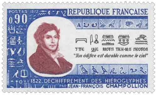 Émis en octobre 1972, le timbre commémorant le 150ᵉ anniversaire du déchiffrement des hiéroglyphes rend hommage à l’un des tournants majeurs de l’histoire intellectuelle moderne : l’accès scientifique au monde de l’Égypte pharaonique grâce aux travaux de Jean-François Champollion. Cette émission s’inscrit directement dans le prolongement symbolique de l’expédition d’Égypte, qui avait mis à disposition des savants européens un ensemble exceptionnel de monuments et d’inscriptions, au premier rang desquels la pierre de Rosette. Né à Figeac en 1790, Champollion manifeste très tôt une aptitude hors du commun pour les langues anciennes et orientales, orientation confirmée dès l’adolescence par ses premiers travaux sur l’histoire et la langue de l’Égypte. Le timbre évoque l’instant fondateur de septembre 1822, lorsque Champollion démontre que l’écriture hiéroglyphique n’est pas un simple système symbolique, mais une écriture complexe mêlant signes phonétiques, idéogrammes et déterminatifs. En s’appuyant sur la comparaison rigoureuse des textes grec, démotique et hiéroglyphique de la pierre de Rosette, puis sur l’identification des cartouches royaux, notamment ceux de Ptolémée et de Cléopâtre, il parvient à restituer les principes fondamentaux de la langue pharaonique. La composition du timbre traduit cette avancée intellectuelle par la juxtaposition de signes hiéroglyphiques, de caractères grecs et de leur traduction française, rappelant visuellement la méthode comparative qui permit la percée décisive. Au-delà de l’exploit philologique, l’émission souligne les conséquences considérables de cette découverte : l’Égypte antique cesse d’être un monde muet et mythifié pour devenir une civilisation historiquement lisible, dont les textes religieux, administratifs et funéraires peuvent désormais être étudiés de manière scientifique. La carrière de Champollion, poursuivie malgré les obstacles politiques et une santé fragile, contribue ensuite à structurer durablement l’égyptologie française, notamment par la création et l’organisation du département des Antiquités égyptiennes du Louvre et par l’instauration d’un enseignement fondé sur l’étude directe des monuments. Gravé en taille-douce par Claude Durrens dans un format horizontal, le timbre combine sobriété graphique et densité symbolique, mettant l’accent sur l’acte de déchiffrement lui-même plutôt que sur le portrait du savant. Par cette émission largement diffusée, la philatélie française célèbre à la fois un anniversaire scientifique majeur et le rayonnement durable de l’école française d’égyptologie, héritière directe de la démarche pionnière de Champollion. Article rédigé pour WikiTimbres