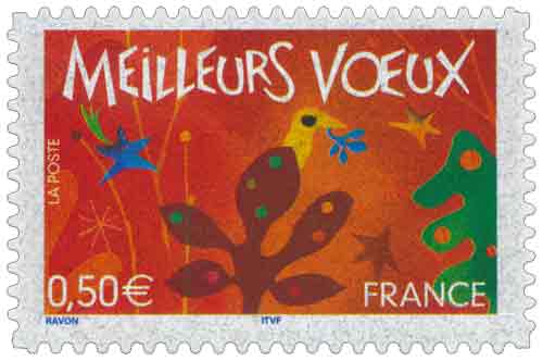 | Commentaire | Meilleurs vœux Émis en carnet, timbre auto-adhésif. Cette année, pour la première fois, le carnet Meilleurs vœux offre 5 visuels différents, chacun en double exemplaire. Timbre sans millésime |