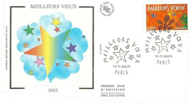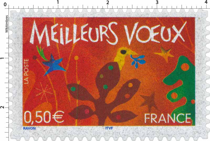 | Commentaire | Meilleurs vœux Émis en carnet, timbre auto-adhésif. Cette année, pour la première fois, le carnet Meilleurs vœux offre 5 visuels différents, chacun en double exemplaire. Timbre sans millésime |
