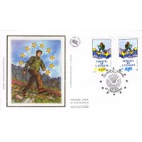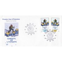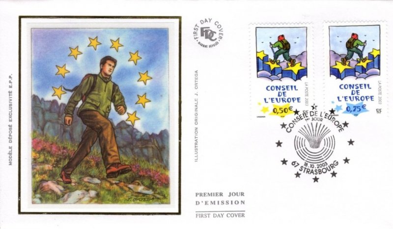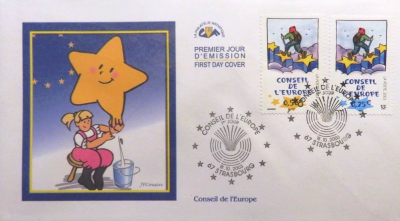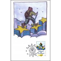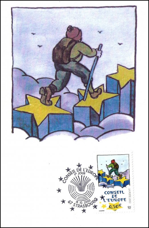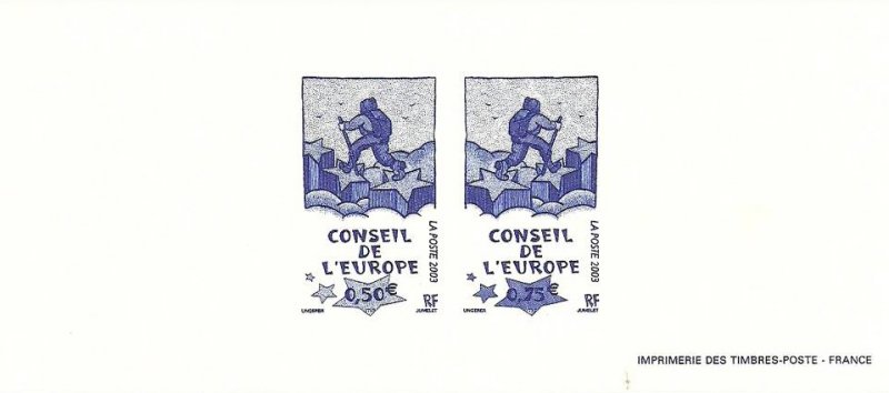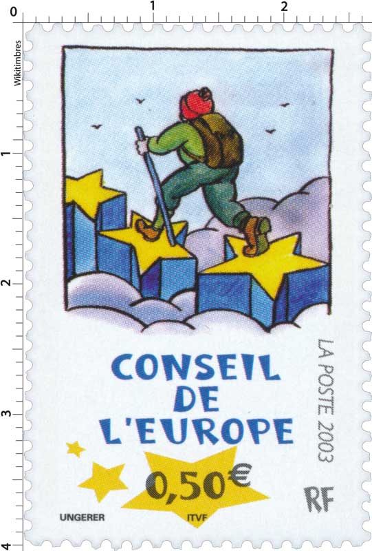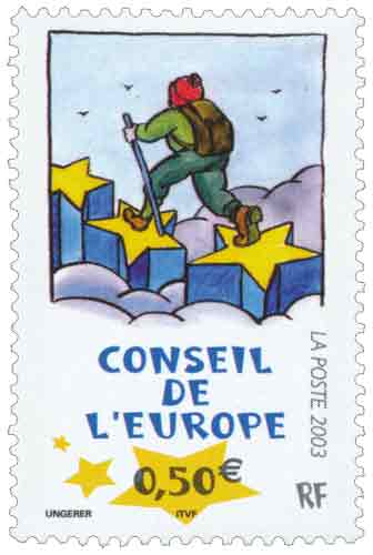| Commentaire | CONSEIL DE L’EUROPE Description synthétique du visuel du timbre Le Conseil de l’Europe a choisi une œuvre de Tomi UNGERER. Le style naïf de cet artiste séduit aussi bien les enfants que les adultes. Le message de l’auteur n’en est que plus fort. Ici, le visuel illustre « le marcheur sur les étoiles » gravissant les étoiles de l’Europe. |