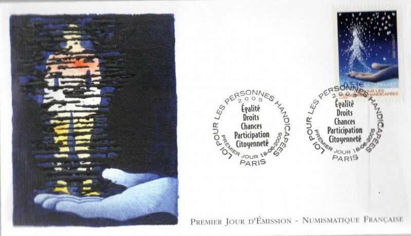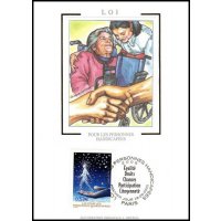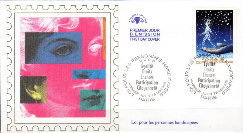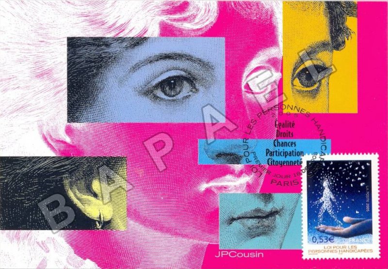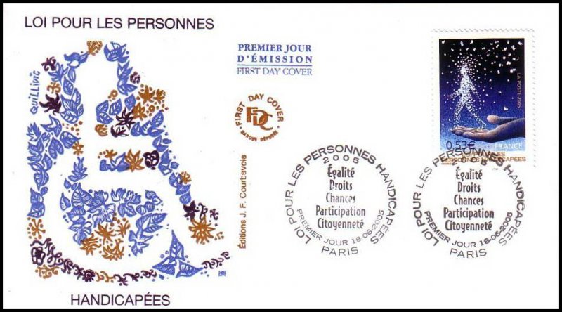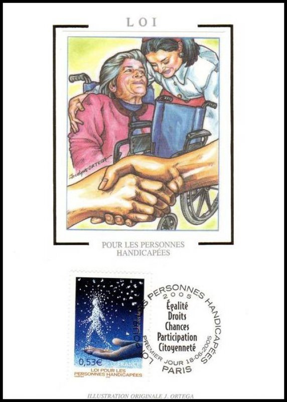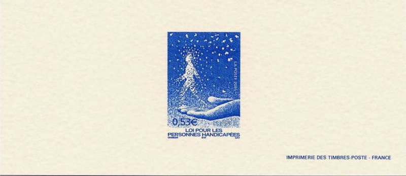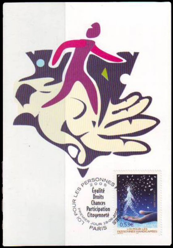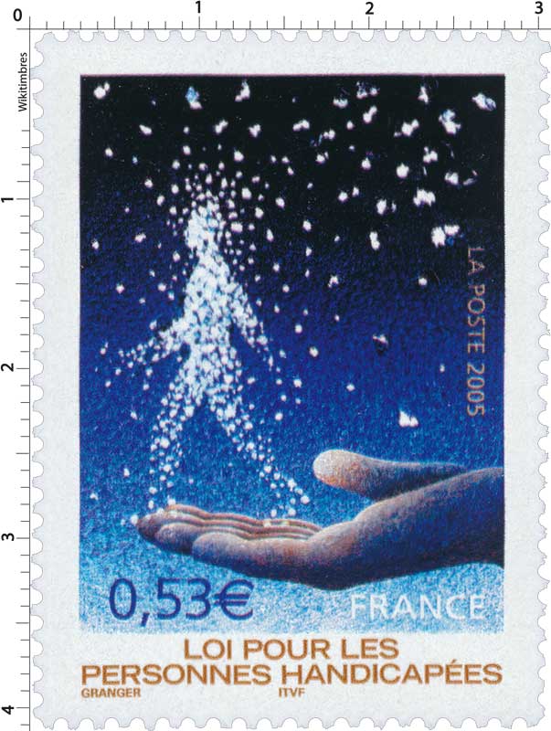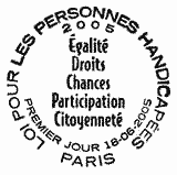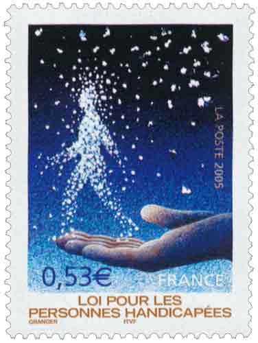 | Commentaire | Le 30 juin 1975 était votée la loi d’orientation en faveur des personnes handicapées. La loi pour l'égalité des droits et des chances, la participation et la citoyenneté des personnes handicapées vient d’être votée en février 2005. Au-delà de la commémoration de ces lois, c’est avant tout le message de l’intégration sociale, de l’accueil et de la responsabilité collective de toute la société vis-à-vis des personnes handicapées que véhicule le timbre. |