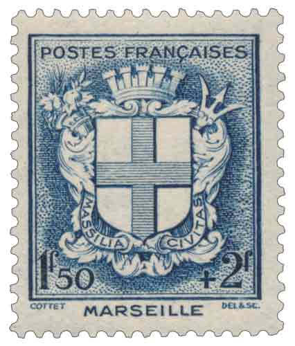 | Commentaire | Ce timbre émis en 1941 illustre les Armoiries de Marseille et fait partie de la première série consacrée aux blasons des villes de France. Dessiné et gravé par René Cottet, il présente un écu d'argent à la croix d'azur, un motif attesté depuis le XIIe siècle et dérivé du drapeau de la ville. D'une valeur faciale de 1,50 F, il comporte une surtaxe de 2 F au bénéfice du Secours National. Ses usages postaux incluaient l'affranchissement des livrets cadastraux jusqu'à 250 g ainsi que certains colis destinés aux militaires. Mis en vente générale le 15 décembre 1941, il a été imprimé en taille-douce rotative sur la presse n° 2, en feuilles de 50 timbres. Son tirage a été limité à 600 000 séries indivisibles avant son retrait le 6 juillet 1942. Une anecdote historique confirmée souligne que le blason de Marseille est l'un des rares à avoir traversé les siècles avec une telle simplicité graphique, la croix bleue sur fond blanc symbolisant traditionnellement les ports de commerce lors des Croisades. |