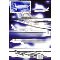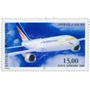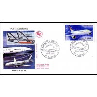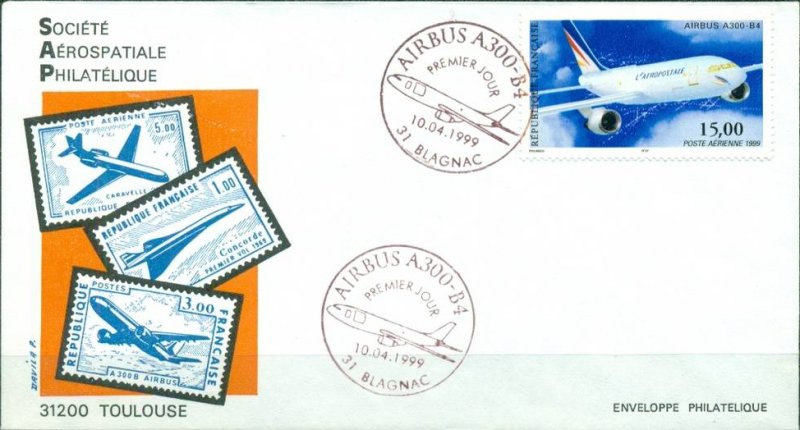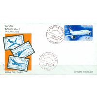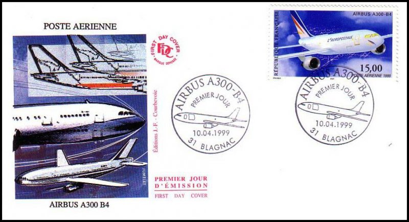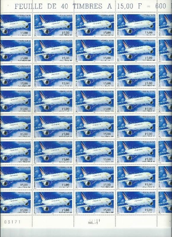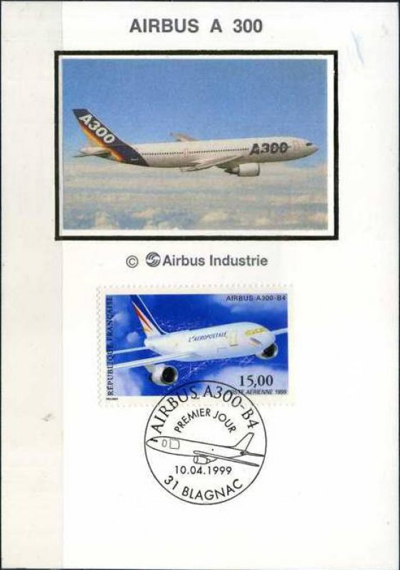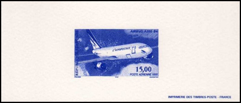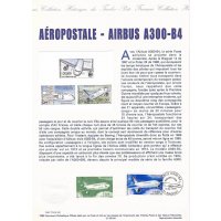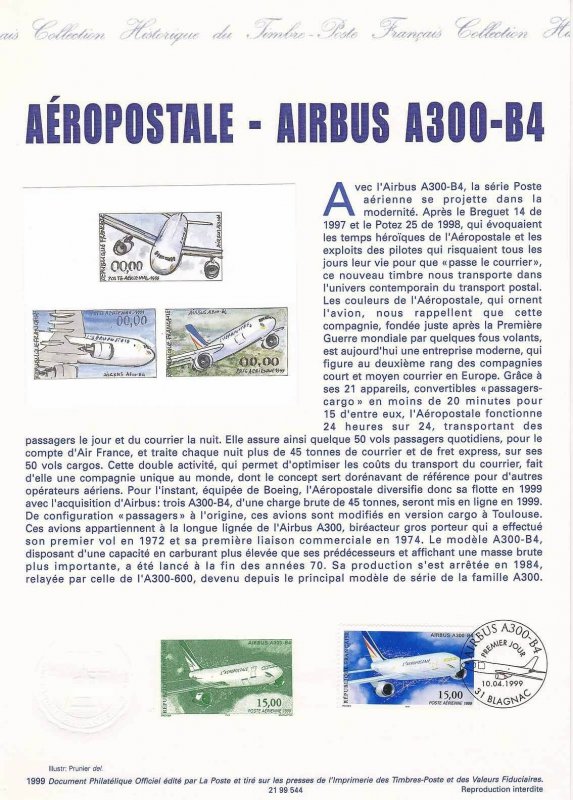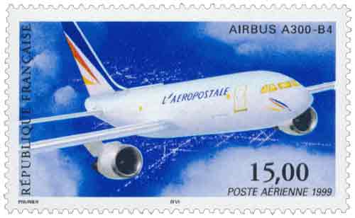 | Commentaire | Description synthétique du visuel du timbre : Faisant suite au Bréguet XIV (programme 1997) et au Potez 25 (programme 1998) qui rendaient hommage à l’époque héroïque de l’aviation postale, l’Airbus A300 - B4 ici représenté symbolise la modernité et le dynamisme actuel et futur de l’Aéropostale. La scène, clin d’œil au transport du courrier de nuit par l’Aéropostale, se déroule dans une atmosphère nocturne et suggère les pistes d’atterrissage éclairées de points lumineux. Ce timbre a également été émis en feuillet de 10 TP, il est alors dentelé 13 x 13demi et comporte des mentions imprimées sur les marges du feuillet. |