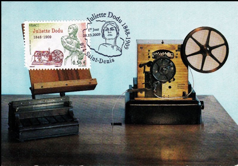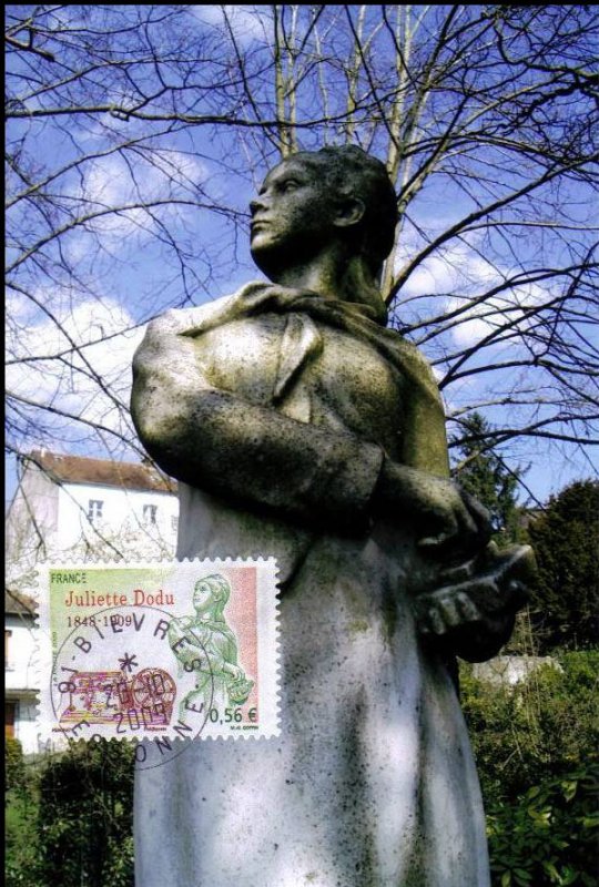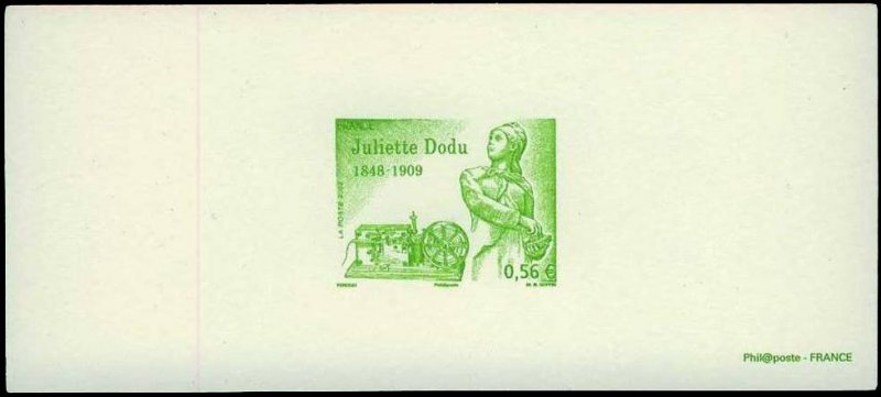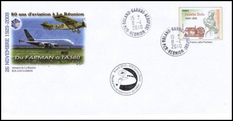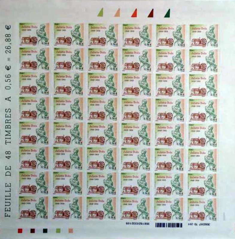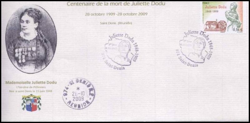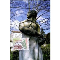 | Commentaire | Existe également sur papier gommé.La mise en vente anticipée a lieu le 28 octobre à Saint-Denis, ville natale de l'héroïne, et à Pithiviers où sa mère dirigeait le bureau télégraphique. À la Réunion, le timbre à date porte la mention « Premier Jour », un profil cartographique de l'île et |