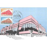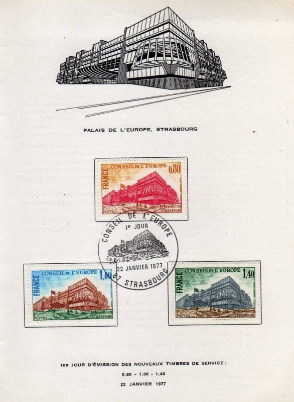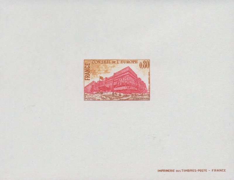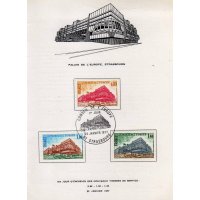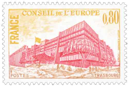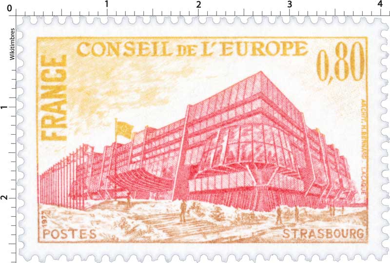 | Commentaire | Visuel : le Palais du Conseil de l'Europe à Strasbourg (1976-1977), architecte, Henri BERNARD (fév.1912 - déc.1994, urbaniste) - 106 m de côté / 38 m de Ht.. Sa surface totale est de 64 000 mètres carrés. Il comprend dix-sept salles de réunions et une centaine de bureaux pour le personnel du secrétariat du Conseil de l'Europe ainsi que l'hémicycle de l'Assemblée parlementaire. L'extérieur du bâtiment est rouge, argent et brun. |