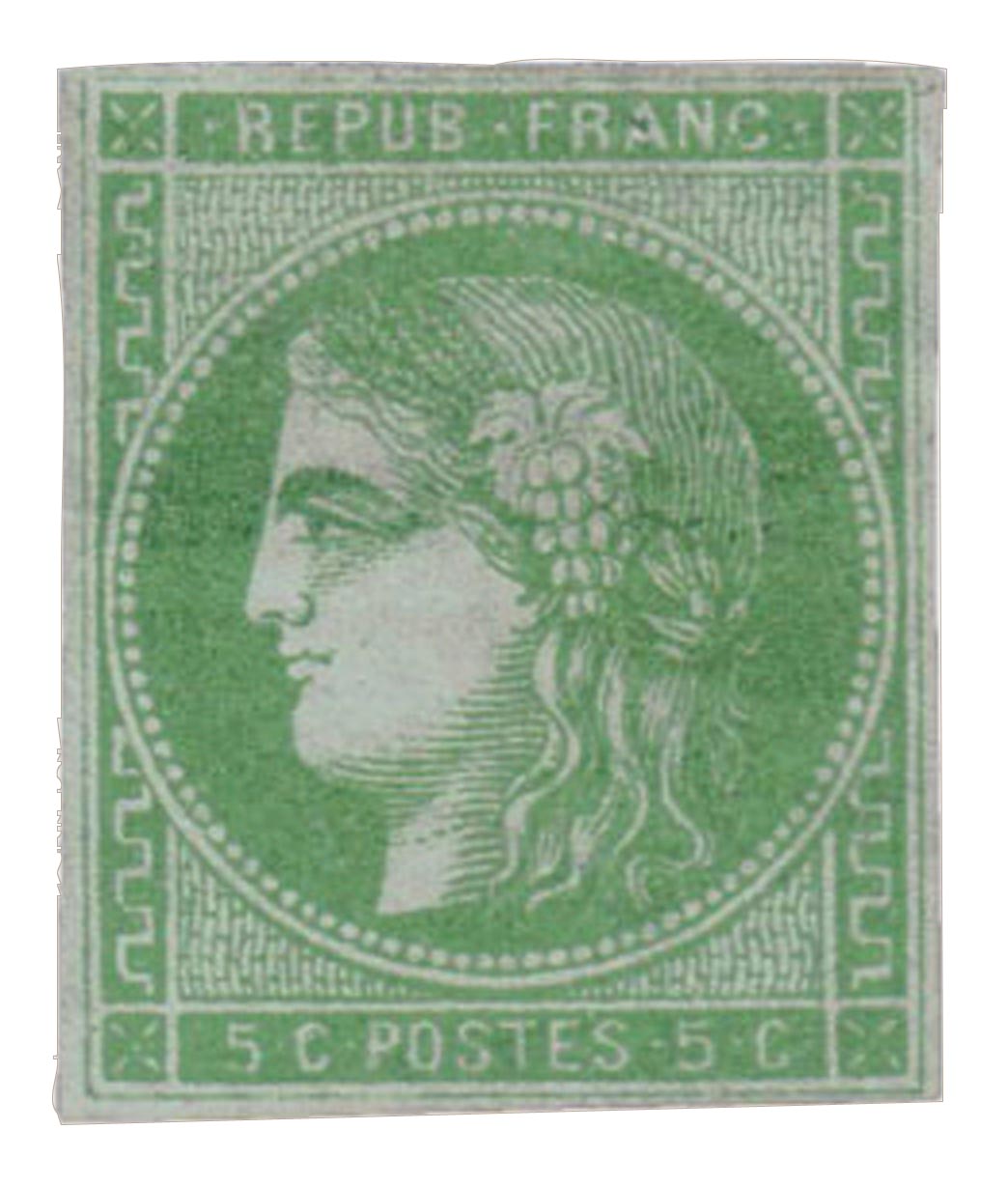 | Commentaire | Cérès - Émission de Bordeaux. Report 2, 1er état, 1er tirage. Le 5 centimes vert-jaune, n°42B, appartient à la série des timbres provisoires de l’Émission de Bordeaux, produite à partir de la fin de 1870 pour répondre à la désorganisation complète du service postal. Après la capitulation de Napoléon III le 2 septembre 1870 et l’encerclement de Paris, les ateliers officiels deviennent inaccessibles, isolant le territoire non envahi de tout approvisionnement en timbres. Le gouvernement de la Défense nationale, réfugié à Bordeaux, rétablit alors l’effigie républicaine du type Cérès afin de remplacer au plus vite les émissions impériales. Ne disposant pas des presses typographiques utilisées à Paris, la Monnaie de Bordeaux adopte la lithographie, technique dont l’usure rapide des pierres impose des remplacements fréquents. Le 5c vert-jaune est émis le 22 décembre 1870 et existe en plusieurs reports, dont le report 2 auquel correspond le n°42B. Chaque report se distingue par de légères variations du dessin liées aux transferts successifs du motif sur pierre. La combinaison des reports multiples, des nuances de couleur et de la fabrication en conditions précaires fait de l’Émission de Bordeaux un domaine d’étude particulièrement riche. Le 5c report 2 illustre parfaitement cette production improvisée, recherchée pour sa diversité et son intérêt historique. |