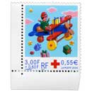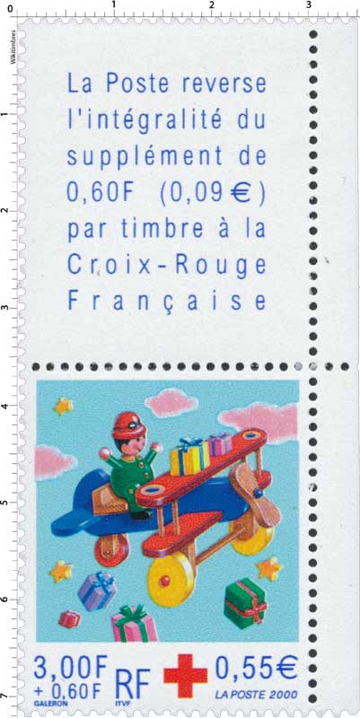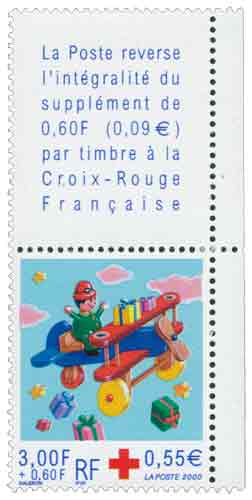 | Commentaire | Description synthétique du visuel du timbre : Un jouet ancien, fait de bois, anime le visuel de ce timbre de fin d’année. Un petit aviateur à bord de son avion, traités dans un style réaliste et mis en scène sur un fond imaginaire, parsème une pluie d’étoiles et de cadeaux multicolores. Ce timbre est grevé d'une surtaxe au profit de la Croix Rouge française. Le même timbre issu de feuille est dentelé 12 demi x 13. Le timbre de carnet comme le timbre de feuille sont imprimés sur un papier avec azurants optiques visibles sous UV. |