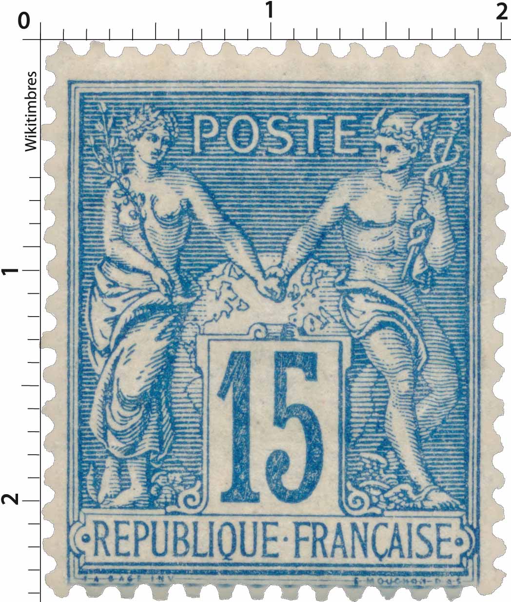 | Commentaire | Sage. Type IIB (N sous U), image du type IIC. Retrait mars 1892 En savoir plus sur Wikipédia : Type sage ou allégorie de la Paix et le Commerce s’unissant Émis en juin 1878, le 15 c bleu type II devient immédiatement la valeur principale du courrier intérieur après l’unification des tarifs du 1ᵉʳ mai 1878. Il sert à l’affranchissement de la lettre simple pour tout le territoire, ce qui en fait l’un des timbres les plus utilisés de la série Sage. L’important volume de consommation entraîne de nombreux faux d’époque, souvent caractérisés par une impression plus plate, des lignes de fond moins nettes ou une teinte anormale. Pour lutter contre ces falsifications, l’administration remplace le fond teinté uniforme par un fond quadrillé incolore, donnant naissance au 15 c bleu n°101 en 1880. En oblitéré, les cachets à date des bureaux ordinaires sont extrêmement fréquents ; les usages postaux réels sur lettres simples bien conservées constituent les pièces les plus représentatives de cette valeur. Aucune réimpression Granet n’existe pour ce numéro. |