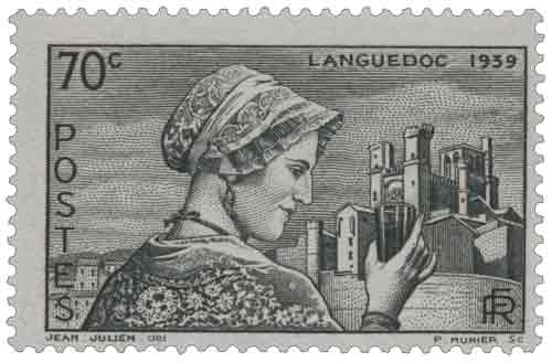 | Commentaire | Languedoc - Cathédrale fortifiée de Béziers. Le timbre à 70 centimes noir sur gris clair, dessiné par Jean Julien et gravé par Pierre Munier, représente une Languedocienne en costume traditionnel contemplant un verre de vin avec en arrière-plan la cathédrale Saint-Nazaire de Béziers, célébrant la région viticole du Bas-Languedoc à la veille du conflit mondial. Imprimé en taille-douce rotative par feuilles de 50 sur presse n° 2, dentelé 13, il est mis en vente le 25 décembre 1939 pour l'affranchissement des cartes postales jusqu'au tarif de novembre précédent et retiré le 28 novembre 1940, tiré à 4,1 millions d'exemplaires. |