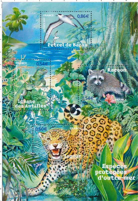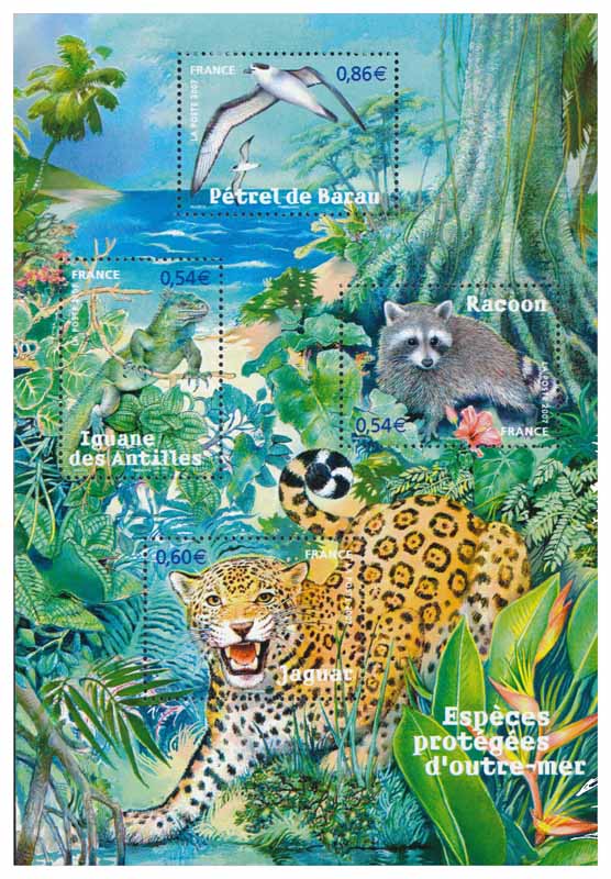 | Commentaire | Les espèces protégées des départements d’outre-mer est le thème retenu pour le bloc Nature que La Poste émet en 2007 – le jaguar (Guyane), l’iguane des Antilles (Martinique), le racoon (Guadeloupe) et le pétrel de Barau (réunion) |
