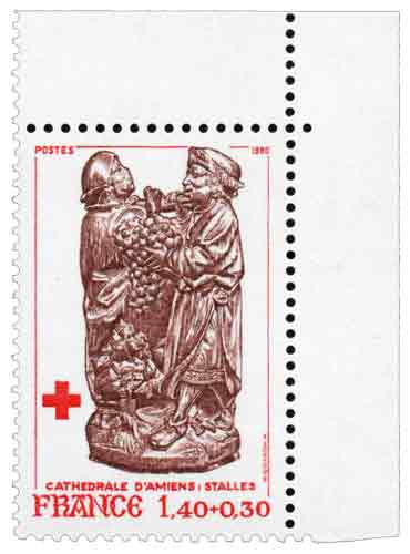 | Commentaire | Ce timbre est grevé d'une surtaxe au profit de la Croix Rouge française. Les timbres émis sous forme de feuilles sont dentelés 13 x 13 Origine : entre 1508 et 1522, le chapitre d'Amiens commanda pour le chœur un vaste ensemble de stalles à sculpter dans le bois, 62 sur la rangée du haut pour les chanoines, 48 sur la marche inférieure pour les desservants des chapelles et pour les chantres. Stalles en chêne massif avec assemblages réalisés par tenons et mortaises. |