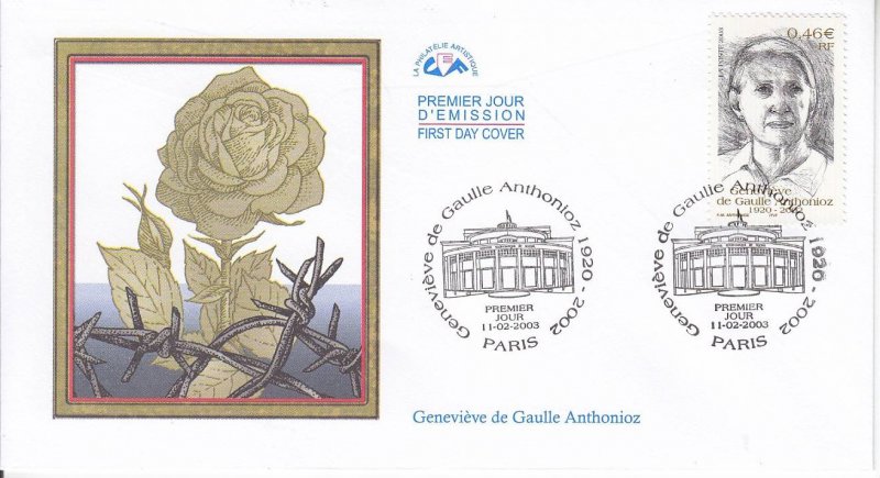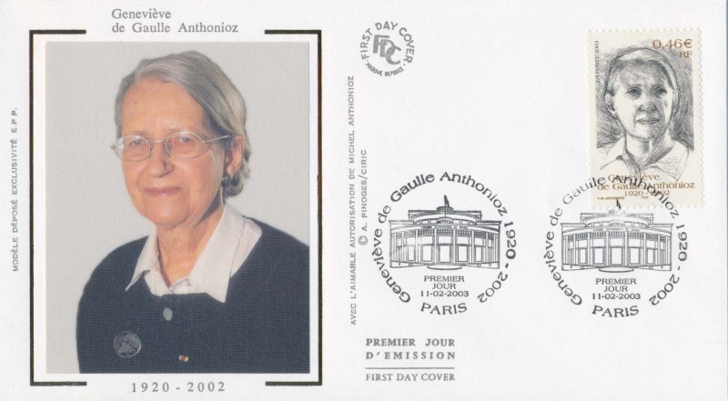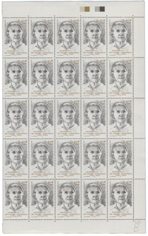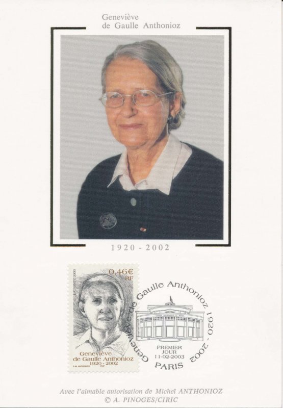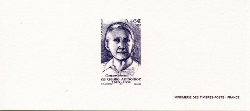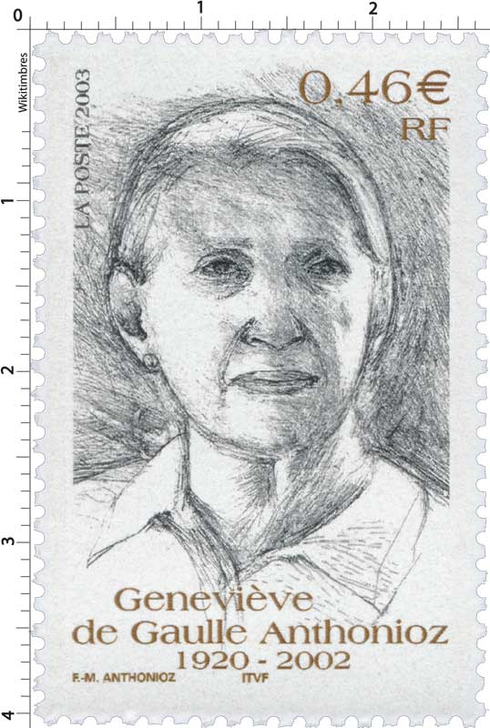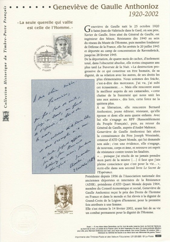 | Commentaire | Existe surchargé de deux bandes phosphorescentes à droite ou à gauche. Description synthétique du visuel du timbre : Née le 25 octobre 1920 dans le Gard, Geneviève de Gaulle Anthonioz perdit sa mère à l’âge de 4 ans et fut élevée par son père Xavier, frère de Charles de Gaulle. Résistante dès 1940 au sein du réseau Musée de l’homme, elle fut arrêtée en 1943 et déportée au camp de concentration de Ravensbrück. Elle présida à partir de 1956 l’association nationale des anciennes déportées et internées de la Résistance et devint conseiller technique au cabinet d’André Malraux en 1958, année au cours de laquelle elle découvrit le camp des sans-logis de Noisy-le-Grand et rencontra le Père Joseph Wrésinski, créateur du mouvement ATD Quart Monde, mouvement qu’elle présida de 1964 à 1998. Alors qu’elle siégeait au Conseil économique et social (de 1988 à 1999), elle multiplia les interventions auprès des gouvernements successifs pour faire aboutir la loi d’orientation relative à la lutte contre les exclusions, votée le 29 juillet 1998. « Dans une société où le combat pour la dignité des hommes et des femmes, la justice et les progrès de la conscience humaine restent plus que jamais une exigence de chaque instant, Geneviève de Gaulle Anthonioz restera comme une lumière » (extrait du communiqué de Jacques Chirac - 15 février 2002) |