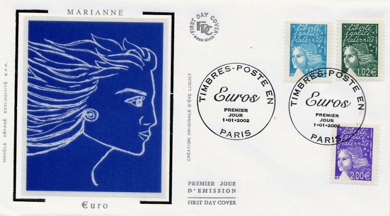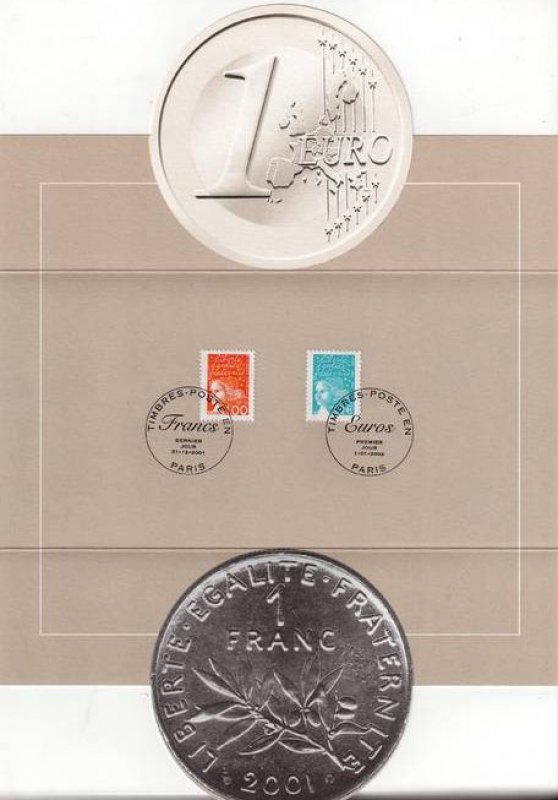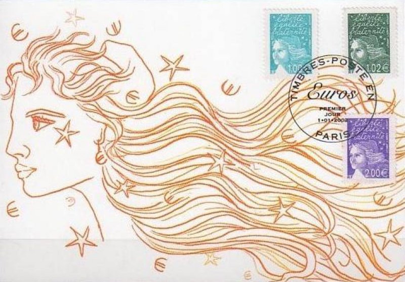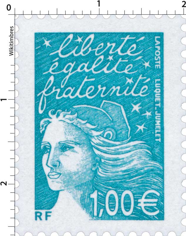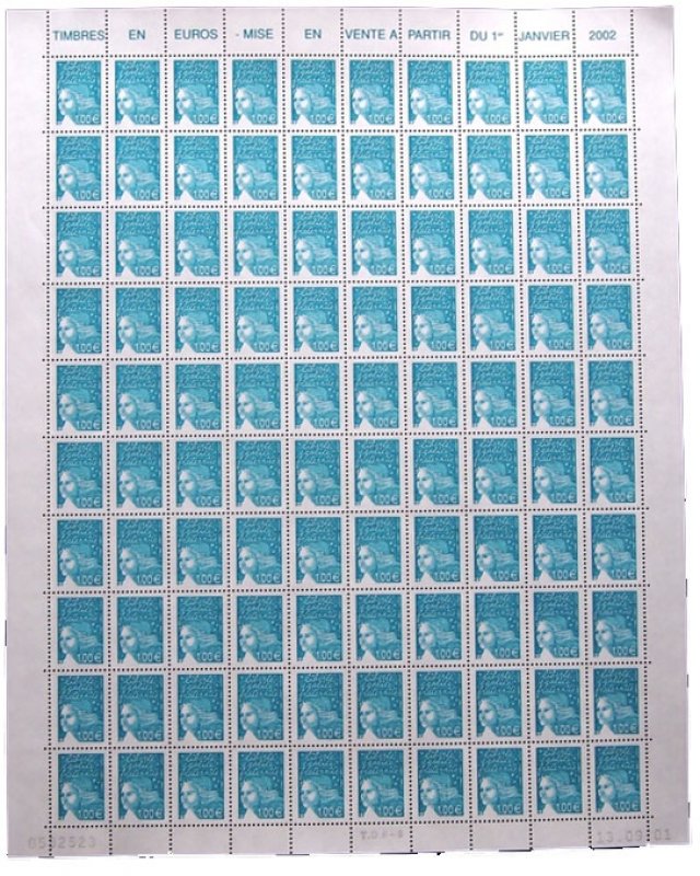 | Commentaire | Les timbres imprimés en 2001, l’ont été en feuilles monobloc de 100 (impression TD6), c'est-à-dire sans pont, séparant la feuille en deux blocs de 50TP (impression RGR), portent dans la marge supérieure la mention : « Timbres en euros mise en vente à partir du 1er janvier2002 ». Le timbre se collectionne soit en haut de feuille complète, soit en séparé avec bord de feuille attenant. Description synthétique du visuel du timbre : En janvier 2002, 15 nouvelles Marianne du 14 juillet seront émises en simple affichage euro. Le TVP, sans affichage de la valeur, est émis plus tôt (août 2001). La nouvelle série émise correspond aux : 8 pièces en euro : 0,01 € - 0,02 € - 0,05 € - 0,10 € - 0,20 € - 0,50 € - 1,00 € - 2,00 € 1er, 2e et 3e échelon de poids de la lettre zone 1, service prioritaire : TVP / 0,69 € (= 4,50 F) / 1,02 € (= 6,70 F) 1er, 2e et 3e échelon de poids de la lettre zone 1, service écopli : 0,41 € (= 2,70 F) / 0,53 € (= 3,50 F) / 0,64 € (= 4,20 F) 1er échelon de la zone 2 et 4, service prioritaire : 0,58 € (= 3,80 F) / 0,67 € (= 4,40 F). Existe avec bandes phosphorescentes à cheval. Existe avec bandes phosphorescentes brisées aux cases 99 et 100. |