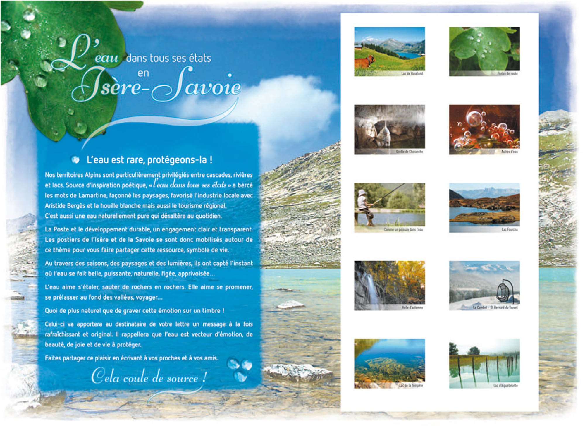 | Commentaire | Livré plié blisté L’eau dans tous ses états L’eau est rare, protégeons-la ! La Poste et le développement durable, un engagement clair et transparent. Les postiers de l’Isère et de la Savoie se sont donc mobilisés autour de ce thème pour vous faire partager cette ressource, symbole de vie. Ces timbres apporteront aux destinataires de vos lettres un message à la fois rafraîchissant et original. Ils rappelleront que l’eau est vecteur d’émotion, de beauté, de joie et de vie à partager. |