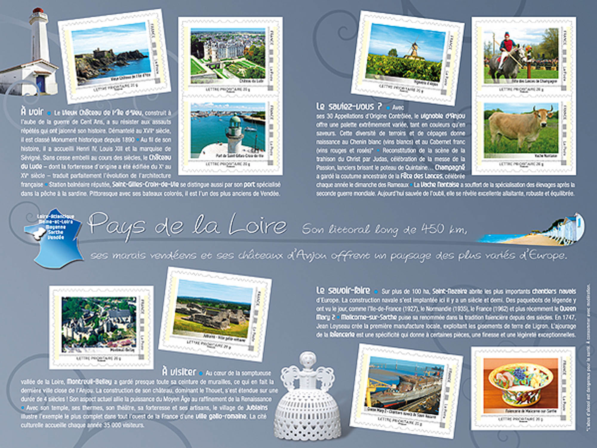 | Commentaire | Vieux Château de l’Ile d’Yeu, Château du Lude, Port de St Gilles Croix de Vie, Montreuil - Bellay, Jublains Ville gallo-romaine, Vignoble d’Anjou, Fête des Lances de Champagné, Vache Nantaise, Queen Mary 2 - Chantiers navals de Saint Nazaire, Faïencerie de Malicorne-sur-Sarthe |