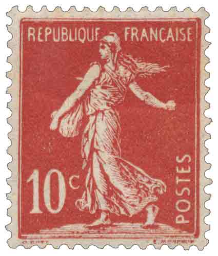 | Commentaire | Semeuse avec sol. Type II. Voir la vidéo "Histoires de timbres" En savoir plus sur Wikipédia : semeuse camée Le 10 centimes rouge – Semeuse fond plein (avec sol), émis le 13 avril 1906, marque un tournant dans l’iconographie postale française. Ce timbre inaugure en effet la série des Semeuses fond plein — aussi appelées Semeuses camées — qui succèdent progressivement aux Semeuses lignée utilisées depuis 1903. Conçue d’après le dessin d’Oscar Roty, la Semeuse fond plein abandonne les lignes horizontales caractéristiques du type ligné pour un fond entièrement uni, renforçant le contraste avec la silhouette emblématique de la semeuse avançant à contre-vent. Le graveur Louis-Eugène Mouchon adapte le modèle de Roty pour une impression en typographie, conservant le dynamisme de la figure tout en offrant une meilleure lisibilité postale. Le tirage est relativement limité pour un timbre d’usage courant : 2 millions d’exemplaires seulement, ce qui en fait aujourd’hui une des valeurs les moins communes de la première période du type fond plein. La présence du sol, visible sous les pieds de la semeuse, constitue une caractéristique distinctive recherchée par les spécialistes, car elle disparaîtra sur d’autres émissions ultérieures. Dentelé 14 × 13½, imprimé en format 20 × 24 mm sur feuilles de 150 timbres, ce 10 c rouge remplissait principalement le rôle tarifaire de la carte postale intérieure à l'époque. Sa courte durée de vente en 1906 explique la rareté relative des oblitérations nettes et de qualité. Le YT 134 occupe une place essentielle dans la chronologie des Semeuses : il représente la transition stylistique majeure entre la Semeuse lignée et les futures Semeuses camées qui domineront les émissions jusqu’aux années 1930. |