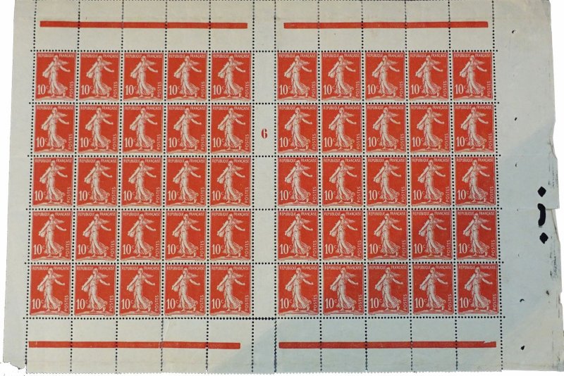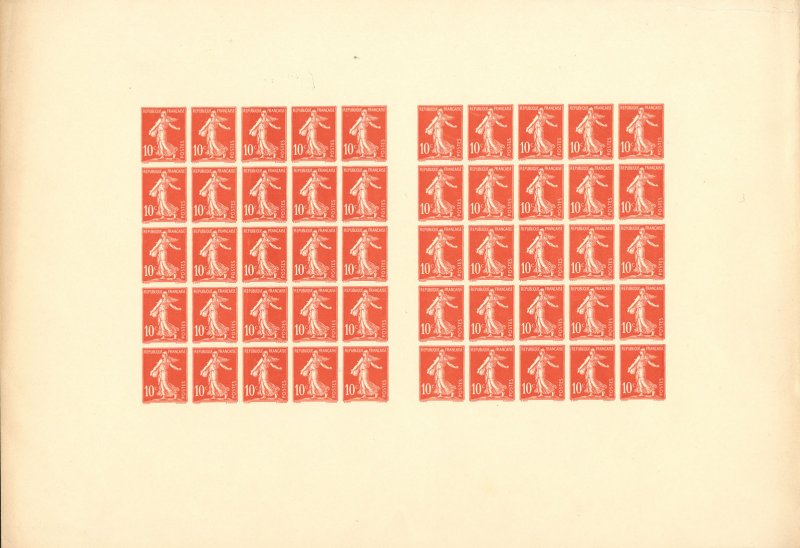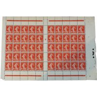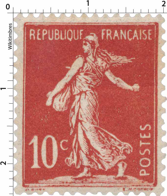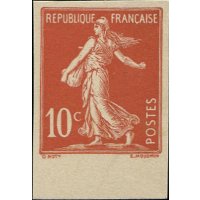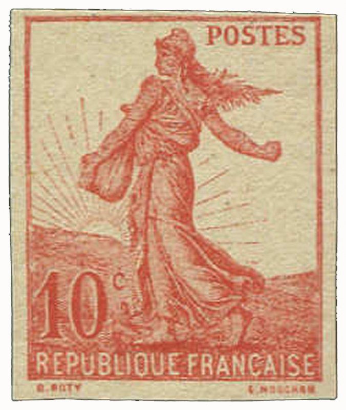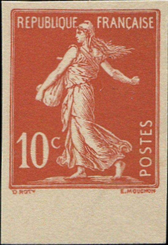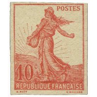 | Commentaire | Semeuse avec sol. Type II. Voir la vidéo "Histoires de timbres" En savoir plus sur Wikipédia : semeuse camée Le 10 centimes rouge – Semeuse fond plein (avec sol), émis le 13 avril 1906, marque un tournant dans l’iconographie postale française. Ce timbre inaugure en effet la série des Semeuses fond plein — aussi appelées Semeuses camées — qui succèdent progressivement aux Semeuses lignée utilisées depuis 1903. Conçue d’après le dessin d’Oscar Roty, la Semeuse fond plein abandonne les lignes horizontales caractéristiques du type ligné pour un fond entièrement uni, renforçant le contraste avec la silhouette emblématique de la semeuse avançant à contre-vent. Le graveur Louis-Eugène Mouchon adapte le modèle de Roty pour une impression en typographie, conservant le dynamisme de la figure tout en offrant une meilleure lisibilité postale. Le tirage est relativement limité pour un timbre d’usage courant : 2 millions d’exemplaires seulement, ce qui en fait aujourd’hui une des valeurs les moins communes de la première période du type fond plein. La présence du sol, visible sous les pieds de la semeuse, constitue une caractéristique distinctive recherchée par les spécialistes, car elle disparaîtra sur d’autres émissions ultérieures. Dentelé 14 × 13½, imprimé en format 20 × 24 mm sur feuilles de 150 timbres, ce 10 c rouge remplissait principalement le rôle tarifaire de la carte postale intérieure à l'époque. Sa courte durée de vente en 1906 explique la rareté relative des oblitérations nettes et de qualité. Le YT 134 occupe une place essentielle dans la chronologie des Semeuses : il représente la transition stylistique majeure entre la Semeuse lignée et les futures Semeuses camées qui domineront les émissions jusqu’aux années 1930. |