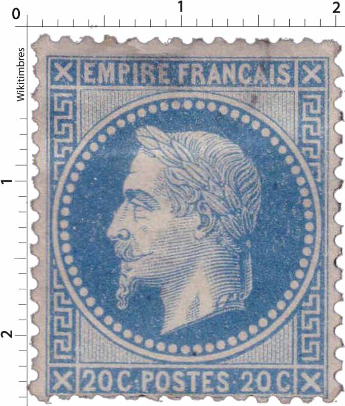 | Commentaire | Napoléon III - Empire lauré. Type I. (petits points entre. POSTES.). Retrait 1868 Le 20 centimes bleu type I, émis en avril 1867, est l’un des timbres les plus diffusés du Second Empire. Destiné à l’affranchissement de la lettre simple de bureau à bureau, son emploi coïncide avec une période d’explosion du trafic postal : il est donc imprimé presque sans interruption, ce qui explique son abondance sur le marché philatélique.