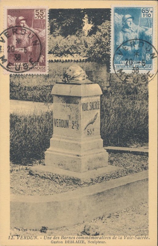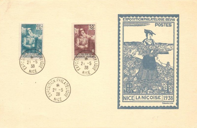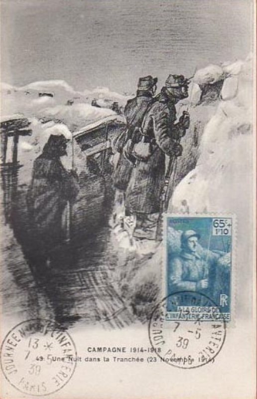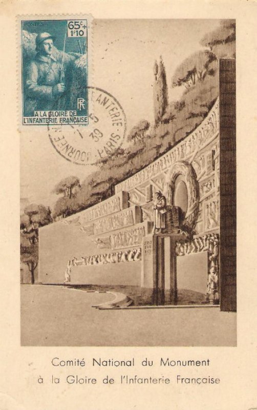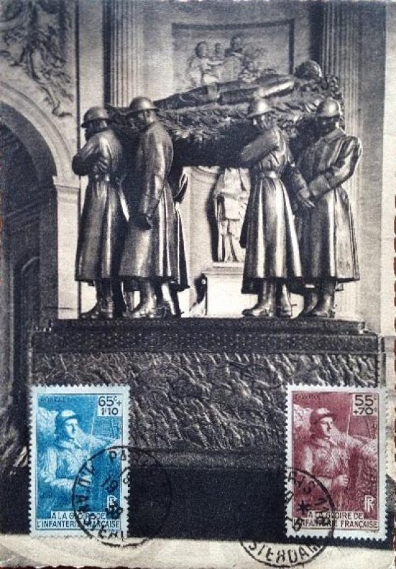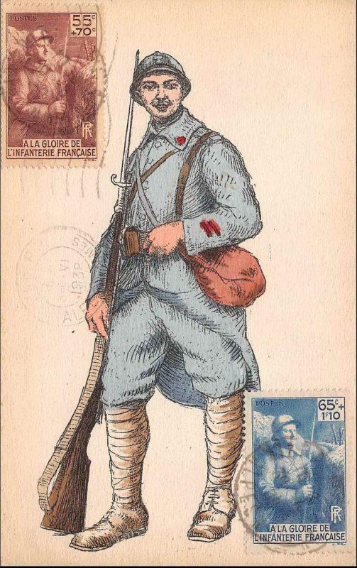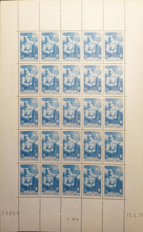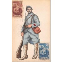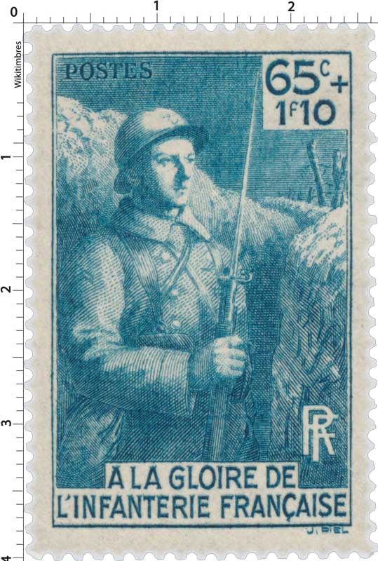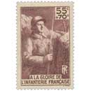 | Commentaire | A la gloire de l'infanterie française. Le timbre a été mis en vente le 16 mai 1938. Il possède une des plus fortes surtaxes de l'année 1938 par rapport à sa valeur d'affranchissement.