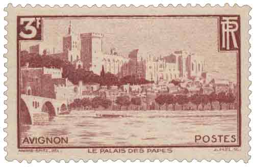 | Commentaire | Avignon - Le Palais des Papes. Voir la vidéo "Histoires de timbres" Émis le 20 juin 1938 dans la série des sites et monuments, ce timbre de 3 francs brun-lilas met en valeur le palais des Papes d'Avignon et le pont Saint-Bénézet, symboles majeurs du patrimoine vauclusien. Dessiné par André Spitz et gravé en taille-douce par Jules Piel, il est imprimé en rotatif sur presses à feuilles de 50 exemplaires. Tiré à 8 millions d'exemplaires, il affranchissait notamment le pneumatique du deuxième échelon ou la lettre lourde intérieure jusqu'à 500 g. Le palais, plus vaste édifice gothique médiéval, fut forteresse et résidence pontificale au XIVe siècle, siège de la chrétienté occidentale lors de la papauté d'Avignon et théâtre de six conclaves. Le pont, vestige du XIIe siècle initié selon la tradition par Bénézet, comptait à l'origine 22 arches pour franchir le Rhône, servant essentiellement au contrôle frontalier et au péage entre État pontifical et royaume de France, avant d'être amputé par les crues successives. |