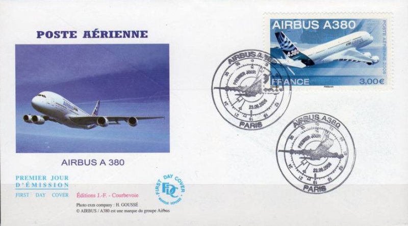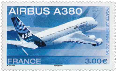 | Commentaire | L’Airbus A380 qui sera mis en ligne en 2006 est l’avion civil le plus moderne, le plus spacieux et le plus performant de tous les temps. Airbus le présente comme le « fleuron du XXIe siècle », il a été conçu en étroite collaboration avec les grandes compagnies aériennes, les aéroports, les autorités aéroportuaires et les services officiels du monde entier. Avec l’A380, c’est un nouvel art du voyage qu’Airbus offre à ses clients et à leurs passagers avec un confort hors pair et davantage d’espace individuel, même en classe économique, sur des lignes telles que Londres-Singapour ou Los Angeles-Sydney. Doté des technologies les plus avancées au niveau des matériaux, systèmes et processus industriels, l’A380 satisfait aux exigences les plus strictes en matière de certification. Ce timbre a également été émis en feuillet de 10 TP et est dentelé 13 et comporte des impressions sur les marges du feuillet. Le timbre de feuille comme le timbre du feuillet de 10 TP sont imprimés sur papier avec azurants optiques visibles sous UV. |