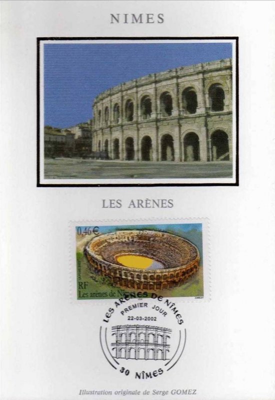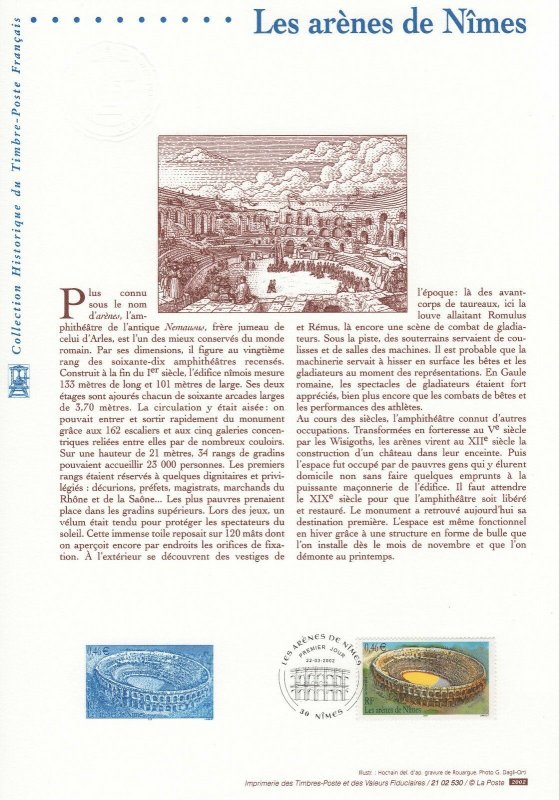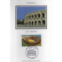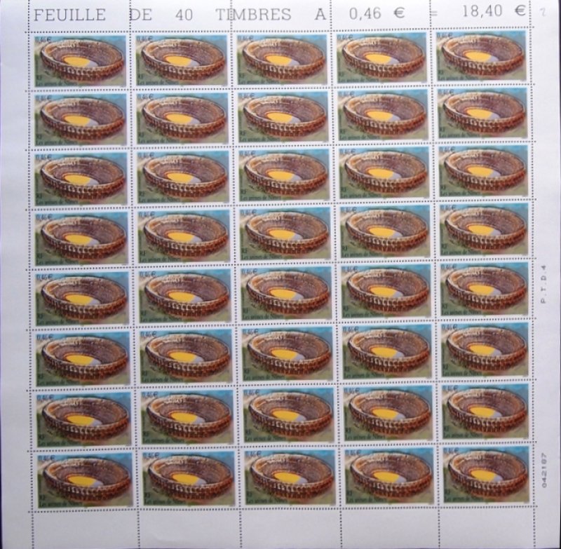 | Commentaire | Description synthétique du visuel du timbre : L’amphithéâtre de Nîmes est l’un des mieux conservés du monde romain. Datant du 1er siècle avant J-C, il était alors destiné à des spectacles de combats d’animaux ou de gladiateurs. Transformé en forteresse au moyen âge, il abrita ensuite un village jusqu’en 1706. Aujourd’hui, des spectacles y sont à nouveau présentés : théâtre, corridas, etc.. L’amphithéâtre mesure 133 x 101 m environ. Sa façade, construite en grand appareil posé à sec, est formée de 2 niveaux d’arcades surmontés d’un attique, le premier niveau étant orné de pilastres toscans sans base et le deuxième de colonnes engagées. |