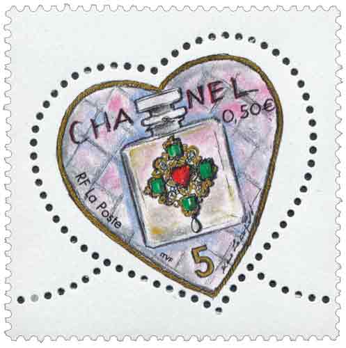 | Commentaire | La collection des « cœurs griffés » s’agrandit : après Yves Saint-Laurent, Christian Lacroix et Torrente, Coco Chanel rejoint le cercle des grands couturiers « timbrifiés ». Dessinés par Karl Lagerfeld, les deux timbres véhiculent l’image de 2 des symboles de CHANEL : le parfum n° 5 de CHANEL (timbre à 0,50 €) et le tailleur ourlé de ganse (timbre à 0,75 €). Timbre sans millésime |