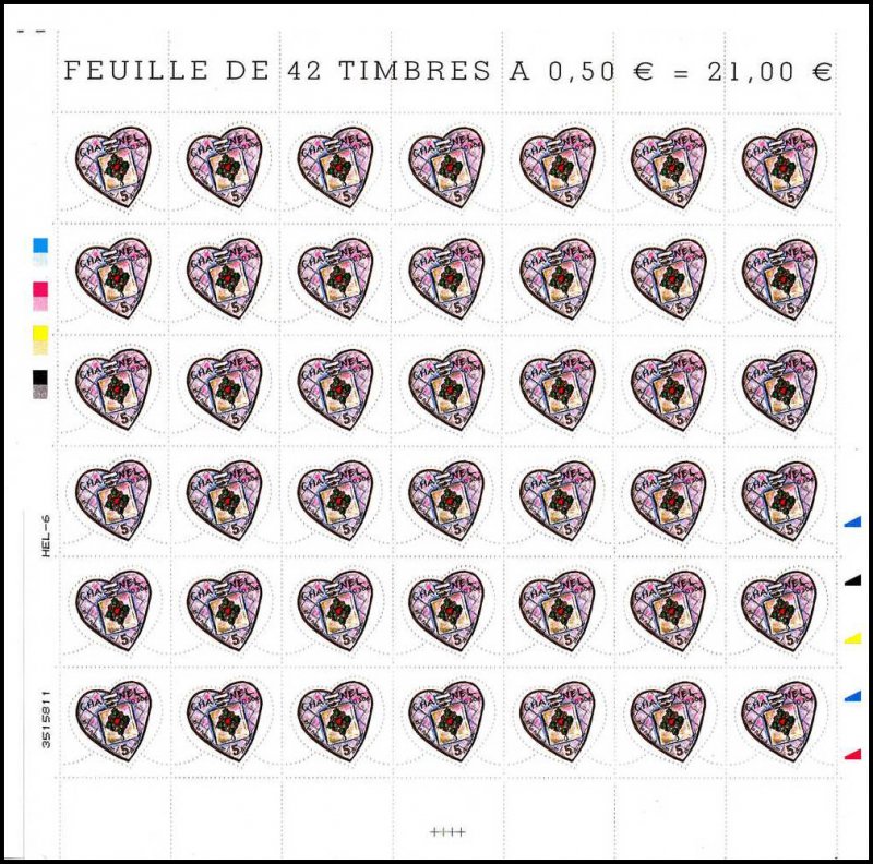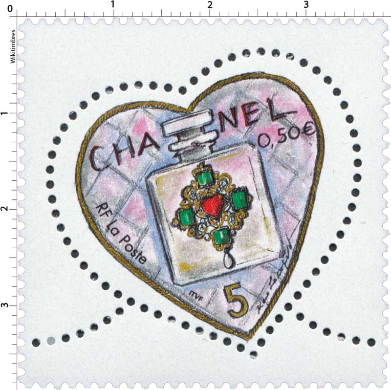 | Commentaire | La collection des « cœurs griffés » s’agrandit : après Yves Saint-Laurent, Christian Lacroix et Torrente, Coco Chanel rejoint le cercle des grands couturiers « timbrifiés ». Dessinés par Karl Lagerfeld, les deux timbres véhiculent l’image de 2 des symboles de CHANEL : le parfum n° 5 de CHANEL (timbre à 0,50 €) et le tailleur ourlé de ganse (timbre à 0,75 €). Timbre sans millésime |