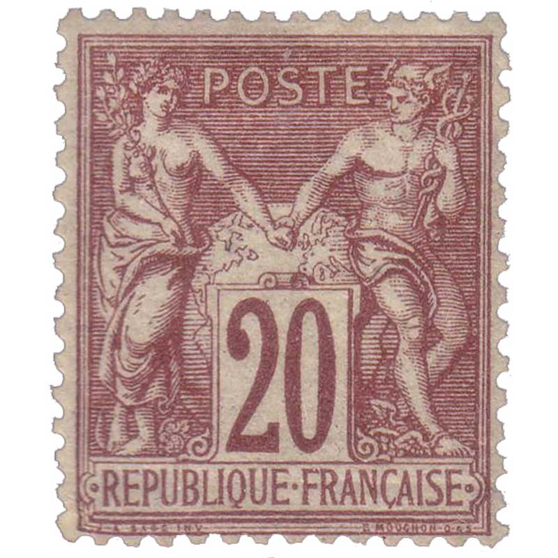 | Commentaire | Sage. Type IA (N sous B) En savoir plus sur Wikipédia : Type sage ou allégorie de la Paix et le Commerce s’unissant Le 20 centimes brun-lilas, n°67, est mis en vente en octobre 1876. Appartenant au type I de la série Sage, il se distingue par une utilisation très ciblée : il sert à l’affranchissement des cartes postales pour l’étranger par voie de mer — notamment vers les pays de la zone 2 jusqu’au 1er octobre 1881 — ainsi qu’au tarif dit frontalier, appliqué aux correspondances à destination de la Belgique, de la Suisse et de l’Espagne. À cette date, les quantités imprimées sont suffisantes, au point que ce timbre n’est plus réimprimé pour la métropole après les premiers tirages. Sa nuance brun-lilas, immédiatement identifiable, répond aux prescriptions du décret de 1875 imposant une différenciation nette entre les valeurs destinées aux usages internationaux. Comme tous les exemplaires du type I, il se reconnaît à la position de la signature « J A SAGE INV », où la lettre N est située sous le B de « RÉPUBLIQUE ». Cette particularité, liée au deuxième poinçon, distingue les premières impressions Sage des types ultérieurs. Le n°67 illustre ainsi l’ouverture internationale du système postal français et l’adaptation progressive de la série Sage aux besoins croissants des échanges transfrontaliers. |