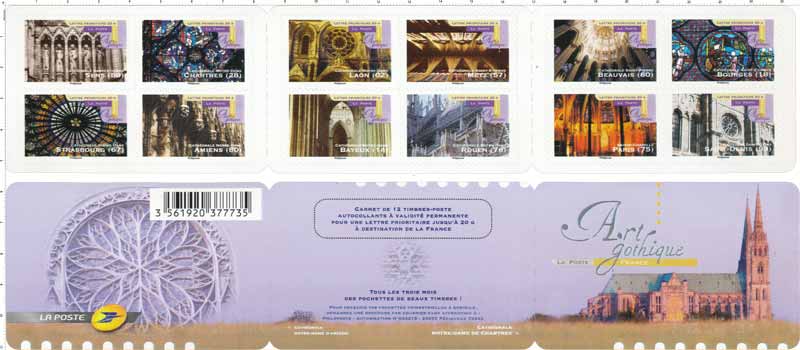 | Commentaire | Les cathédrales sont Les chefs d'œuvres de L'art gothique. Les 12 timbres de ce carnet portent sur des éléments architecturaux caractéristiques de L'esthétique gothique: La recherche de hauteur et de verticalité permises par La croisée d'ogives, Les jeux de couleurs de La Lumière pénétrant par Les vitraux, La multiplication des colonnettes, des sculptures, et Les façades de plus en plus décorées |