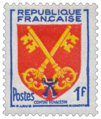 | Commentaire | Émis en 1955 dans le cadre de la huitième série des Armoiries des provinces françaises, le timbre consacré aux armoiries du Comtat Venaissin reprend le blason traditionnel de cet ancien État pontifical, territoire relevant des États de l’Église jusqu’à son rattachement à la France à la fin du XVIIIᵉ siècle, l’illustration héraldique étant traitée de manière volontairement épurée afin de garantir une parfaite lisibilité dans le petit format vertical caractéristique de la série, l’objectif de cette émission étant moins décoratif que patrimonial, en rappelant par l’image postale l’existence d’entités historiques disparues mais structurantes pour l’histoire administrative et politique de la France, ce timbre s’inscrivant ainsi dans une démarche pédagogique et mémorielle comparable à celle des autres valeurs de la série, largement diffusées dans le courrier courant de l’époque. |