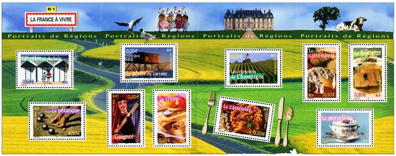 | Commentaire | Portraits de régions La France à vivre Description synthétique du visuel du timbre : Ce bloc « Art de vivre » inaugure une série « Portraits de régions ». Les thèmes illustrant le bloc ont été retenus à la suite d’un sondage auprès des Français : Les cabines de bain, La pétanque, La pêche au carrelet, Guignol, la crêpe, Les vignobles de Champagne, Le cassoulet, Le camembert, Le foie gras et La porcelaine. Le bloc vendu à plat peut être plié voire découpé en 4 (pliage et découpage facilité par l’imposition de perforation strip. |