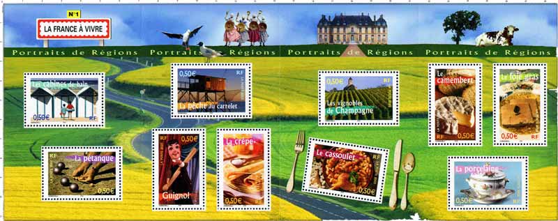 | Commentaire | Portraits de régions La France à vivre Description synthétique du visuel du timbre : Ce bloc « Art de vivre » inaugure une série « Portraits de régions ». Les thèmes illustrant le bloc ont été retenus à la suite d’un sondage auprès des Français : Les cabines de bain, La pétanque, La pêche au carrelet, Guignol, la crêpe, Les vignobles de Champagne, Le cassoulet, Le camembert, Le foie gras et La porcelaine. Le bloc vendu à plat peut être plié voire découpé en 4 (pliage et découpage facilité par l’imposition de perforation strip. |