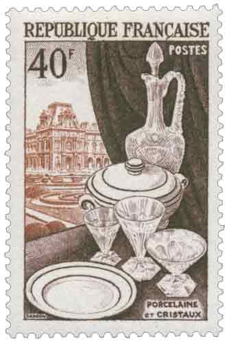 | Commentaire | Émis en France en 1954, le timbre-poste gommé de la série des productions françaises de luxe consacré aux Porcelaines et aux Cristaux illustre deux métiers d’art emblématiques du savoir-faire national, associés à la fois à l’art de la table, à la décoration intérieure et au prestige culturel français. Mis en vente à Paris le 6 mai 1954 puis généralisé le 8 mai, ce timbre de 40 francs s’inscrit dans une série courante destinée à symboliser des branches caractéristiques de l’activité commerciale française, poursuivant la volonté d’après-guerre de valoriser l’excellence artisanale par la philatélie. Son usage postal principal correspond notamment aux suppléments d’affranchissement des envois de librairie à destination des DOM, TOM et de l’Afrique du Nord, cohérent avec une valeur faciale élevée adaptée aux services spécifiques. Le dessin, réalisé et gravé en taille-douce par Pierre Gandon, associe des tons brun, violet et brun-jaune et met en scène, en arrière-plan, le palais du Louvre à Paris, symbole du patrimoine artistique national, tandis que le thème évoque l’essor historique de la porcelaine et de la cristallerie françaises depuis le XVIIIᵉ siècle, de Sèvres et Limoges aux grandes cristalleries de Lorraine. Imprimé en taille-douce rotative, le timbre témoigne de la maîtrise technique de l’imprimerie française du milieu du XXᵉ siècle et de l’attention portée à la qualité esthétique des émissions courantes, à une époque où l’art décoratif retrouve une place centrale dans la vie quotidienne et les usages culturels. |