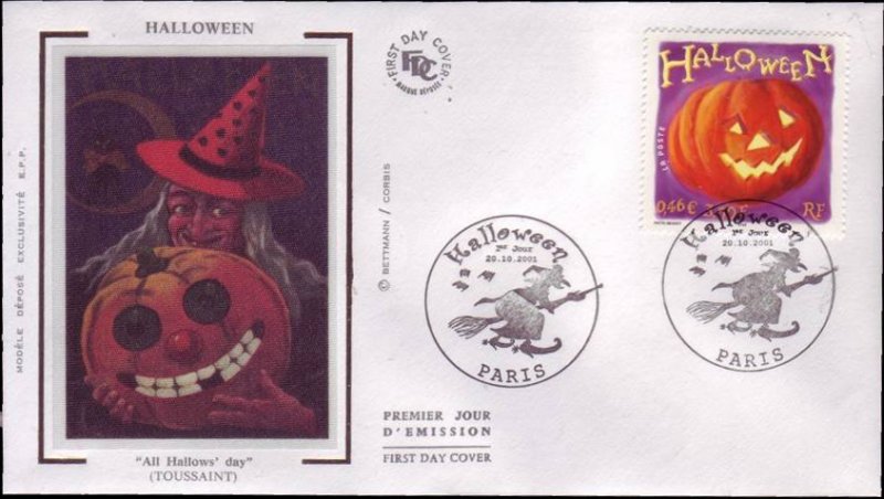| Commentaire | Description synthétique du visuel du timbre : Il y a plus de 2500 ans, les Gaulois étaient le peuple le plus riche et le plus nombreux, au point que Grecs et Romains appelaient les Celtes : les Gaulois. L’année gauloise se terminait à la fin de l’été, jour qui correspond aujourd’hui au 31 octobre. En cette nuit du 31 octobre au 1er novembre commençait la fête de Samain. Cette fête gauloise, la plus importante, durait jusqu’à 15 jours. Les Gaulois y étaient grimés et vêtus de costumes terrifiants pour effrayer les esprits censés rendre visite à leurs parents. Le mot anglais vient de l’époque du pape Grégoire IV (828 à 844) qui installa la fête de la Toussaint et décréta que ce jour et la veille seraient observés : All Hallows’day (Toussaint) et All Hallow la (nuit sainte qui précède). Alors qu’en France, la culture celte disparaissait, celle-ci continua de se développer en Irlande, Écosse, Pays de Galles … La grande émigration irlandaise de 1846 / 1848 vers les Etats-Unis à la suite d’une famine emporta avec elle les pratiques d’Halloween. Une citrouille, dont certains détails seront recouverts d’encre phosphorescente visible dans l’obscurité, illustre le timbre. Timbre sans millésime |