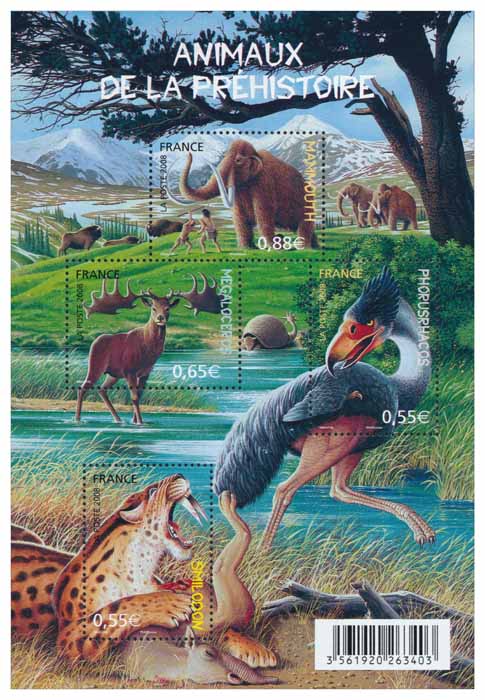 | Commentaire | La Préhistoire est considérée comme la période de l'histoire humaine qui a précédé l'apparition de l'écriture. De nombreux animaux aussi étranges que fantastiques ont vécu à cette époque. Quatre d’entre eux ont été retenus pour illustrer les timbres de la série Nature 2008, deux prédateurs (en Amérique du Sud et du Nord) et deux herbivores (en Europe) : le mammouth ou mammouth laineux, un mammifère herbivore d’environ 3,5 mètres de haut, le smilodon ou tigre à dents de sabre, un mammifère carnivore de 1,20 mètres de haut, le mégaloceros, un mammifère herbivore de 2,10 mètres de haut, Le phorusrhacos surnommé l’oiseau de la terreur, un oiseau carnivore et prédateur de 3 mètres de haut. Ils sont accompagnés d’un doedicurus qui s’abreuve et de bisons, des hommes entourent le mammouth, et un macrauchenia gît entre les griffes du smilodon. |