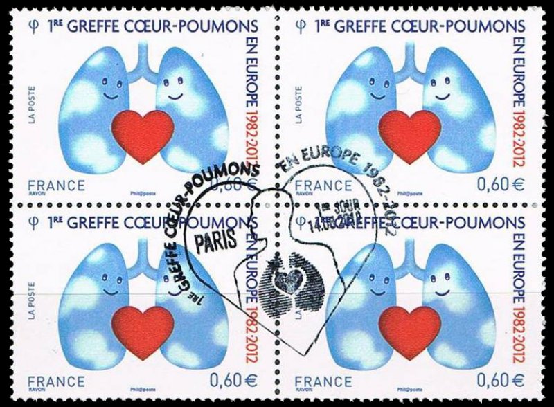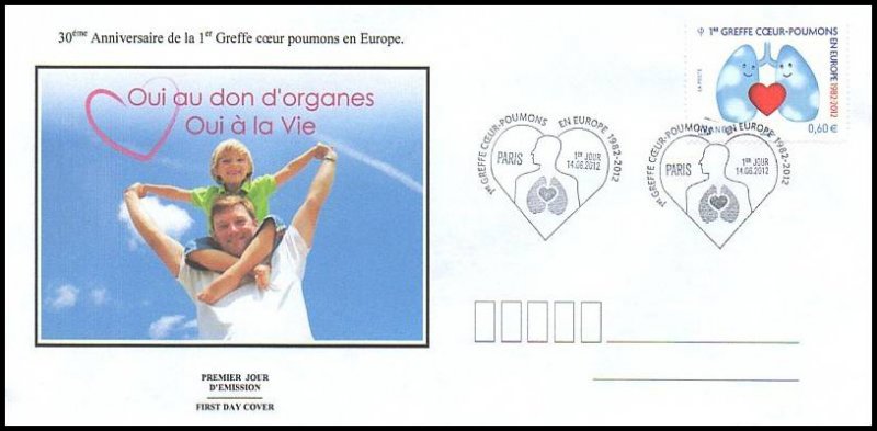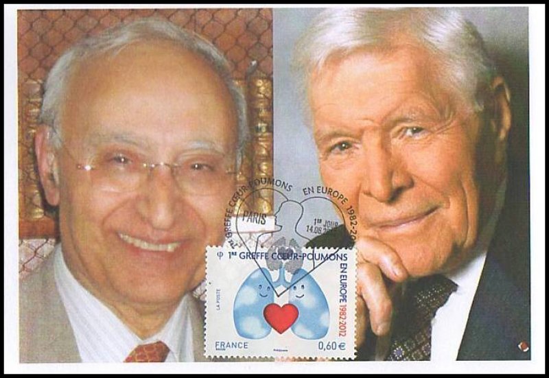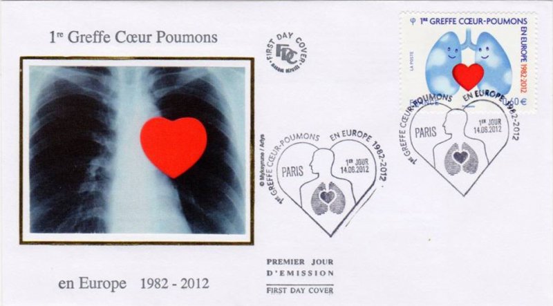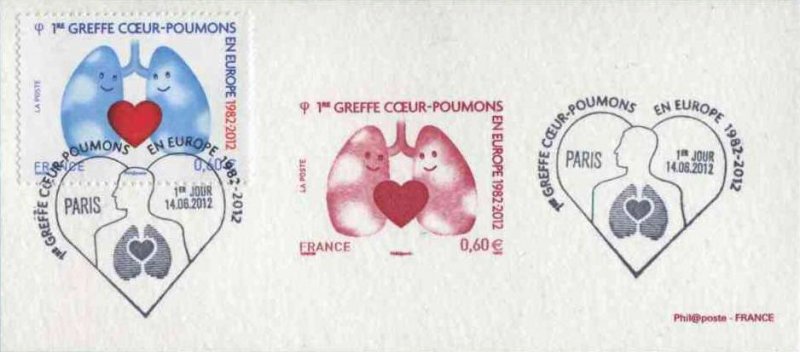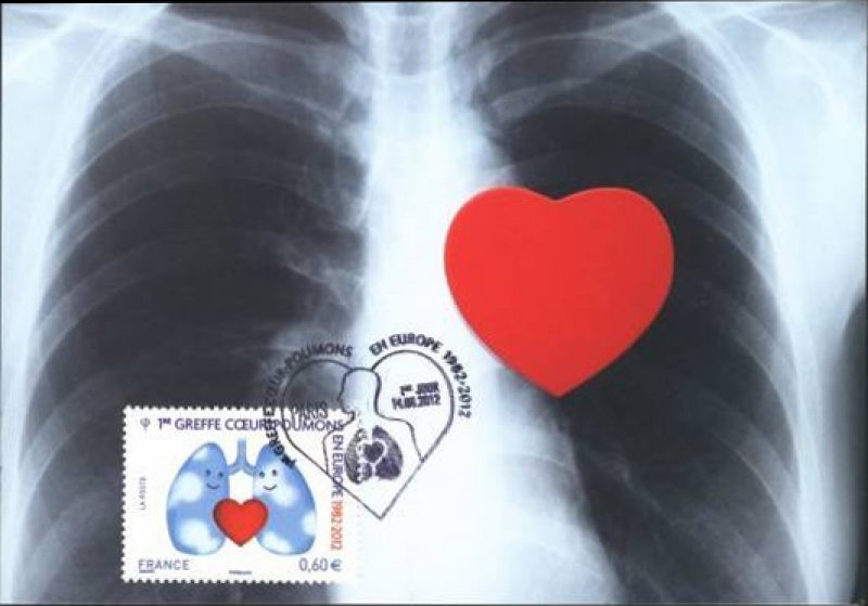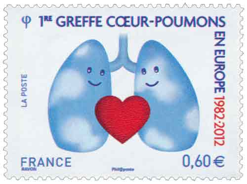 | Commentaire | Timbre à date “Premier Jour” conçu par Philippe Ravon. Émis lors du salon du timbre 2012 En 1982 était effectuée la première greffe coeur-poumons en Europe par les professeurs Christian Cabrol et Iradj Gandjbakhch. Grâce à la découverte d'un anti-rejet efficace, la cyclosporine, la première série de greffes coeur-poumons put être entreprise en Europe avec succès. Aujourd'hui, les résultats sont stables. Comme pour la transplantation cardiaque, le nombre insuffisant de donneurs constitue la limite essentielle à la transplantation cardio-pulmonaire. Elle n'est actuellement indiquée que dans trois pathologies essentielles : l’hypertension artérielle pulmonaire primitive isolée (26 % des cas), ou associée à des cardiopathies congénitales (27 %) et la mucoviscidose (16 %). |