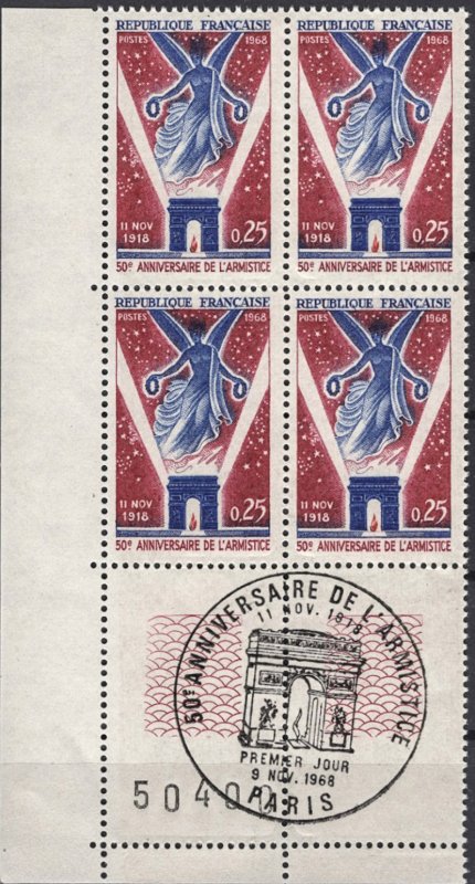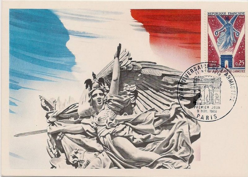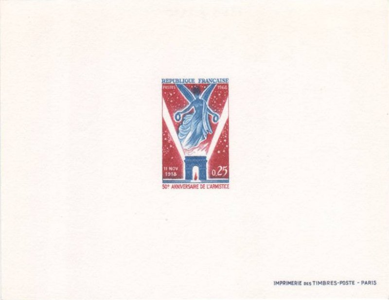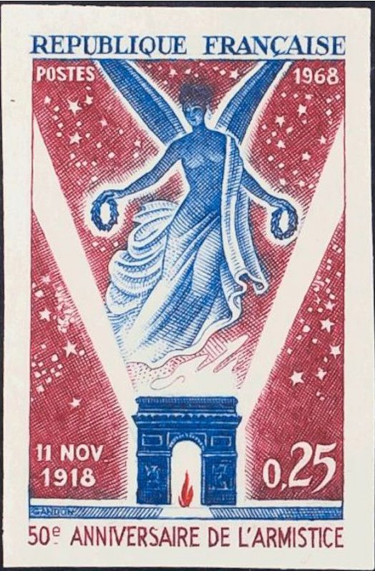 | Commentaire | Visuel : la victoire ailée bleu horizon tenant dans chacune de ses mains une couronne de lauriers tressés. En pleine réconciliation entre les peuples, ce timbre commémore l'immense élan de joie dans lequel se termina cette guerre. Tu veux un truc dingue ? Le 11 novembre 1918, à cinq heures du matin, dans un fichu wagon paumé en pleine forêt, des types en uniforme ont mis fin à une guerre qui bouffait le monde depuis plus de quatre ans. Quatre ans ! T’imagines le silence, à onze heures, quand le clairon a retenti ? (Le clairon s’appelait Sellier, je le glisse là, au cas où tu veuilles briller au Trivial Pursuit.) Et là, bam — les cloches de toutes les villes, de tous les villages. Le pays entier respire, pleure, crie. J’ai lu quelque part que même les pigeons s’étaient tus, mais bon, peut-être que j’invente. C’est possible. Avant ce moment suspendu, y’a eu des semaines de chaos. En gros, ça s’est effondré comme un château de cartes trempé : l’Autriche-Hongrie lâche, l’Allemagne tente de négocier par la Suisse (ça sent l’embrouille), et le Kaiser, hop, file en douce se planquer aux Pays-Bas. Même les chefs militaires allemands ont été mis sur la touche. Et au milieu de tout ça, Clemenceau qui lâche ses punchlines : « La France, soldat de Dieu, de l’humanité, de l’idéal ». Grandiloquent ? Peut-être. Mais va savoir… après 52 mois de boue, de sang et de deuils, on a le droit de s’enflammer un peu. Et puis, en 1968, paf — un timbre. Bleu. Rouge. Sobre. Juste pour se souvenir. Pas du décor, mais de ce que ça a coûté pour en arriver là. Je sais pas toi, mais moi, ça me touche. WikiTimbres |