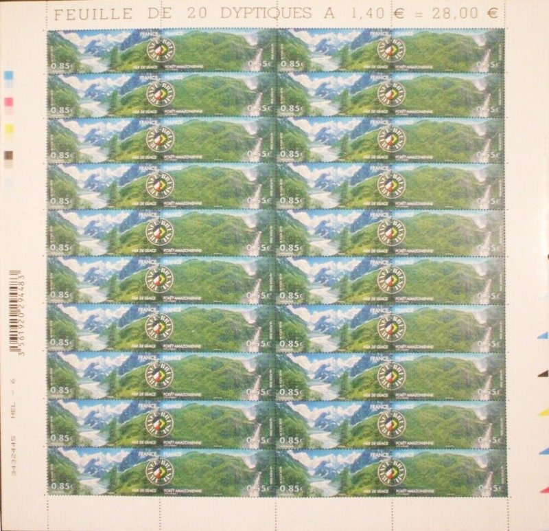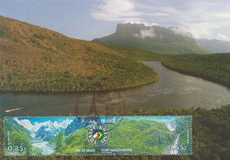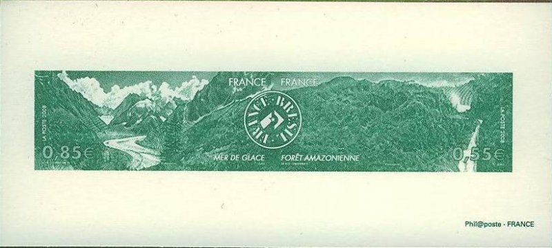 | Commentaire | Paysage de France et du Brésil. La mer de Glace, vallée de Chamonix. La mise en vente anticipée a lieu les 21 et 22 juin au Salon du timbre, à Paris. Le timbre à date « premier jour » est dessiné par Claude Perchat qui place côte à côte la tour Eiffel et le Christ Rédempteur de Rio de Janeiro. En 2009, le timbre est élu « plus beau timbre de l'année » dans la catégorie « timbre en offset ou en héliogravure » suite à un vote des internautes, organisé par Phil@poste |