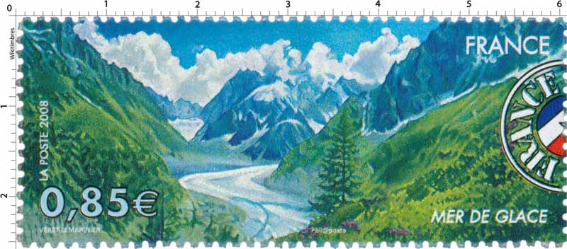 Paysage de France et du Brésil. La mer de Glace, vallée de Chamonix. La mise en vente anticipée a lieu les 21 et 22 juin au Salon du timbre, à Paris. Le timbre à date « premier jour » est dessiné par Claude Perchat qui place côte à côte