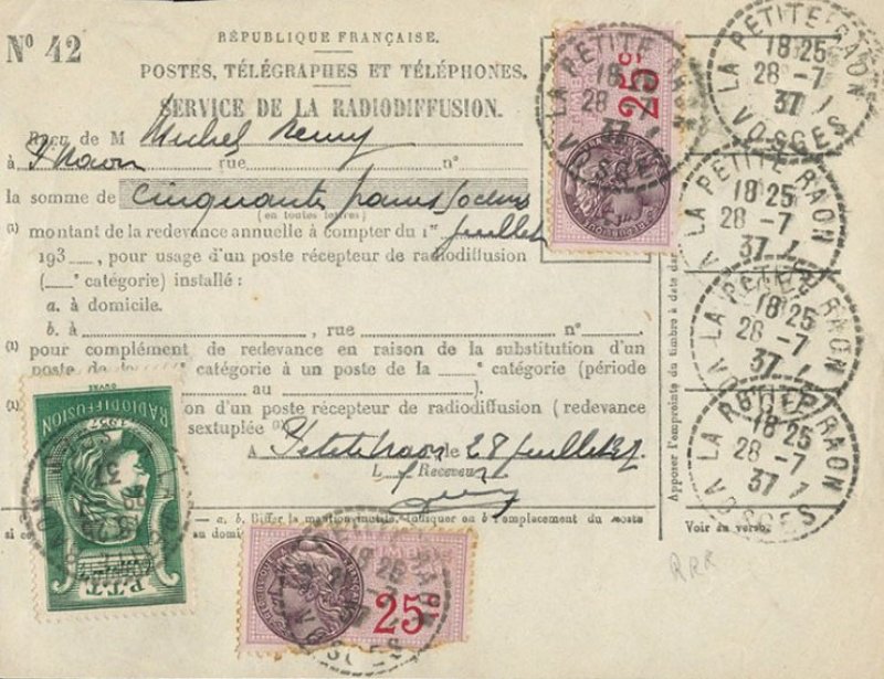 | Commentaire | Ce timbre servait à matérialiser le paiement de la taxe due par les possesseurs d'appareils radiophoniques. En principe ce timbre devait être collé au dos de l'appareil radiophonique La taxe était d'un montant de 50 francs |