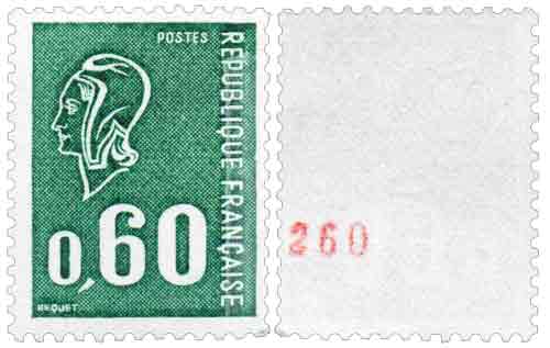 | Commentaire | Émis en roulettes de 1000 timbres le TP est revêtu d'une bande phosphorescente à droite. Les dents latérales sont massicotées. Le dos des timbres est revêtu d'un numéro en rouge tous les 10 timbres. Le premier numéro est 000, le dernier 010, le timbre étant gravé, il est revêtu de la signature du dessinateur et du graveur. |