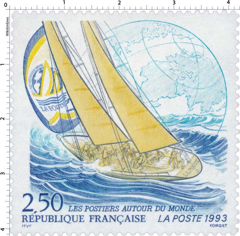 Timbre : 1993 LES POSTIERS AUTOUR DU MONDE Mesures Format d'imp 37 x 37 mm Dents incluses 41 x 41 mm Forme carré Phosphore Non Impression Taille-douce Complément xxxxx Couleur polychrome Valeur 2 F 50 c Dentelure 13 Emis en feuille de 30 TP Quantité 16 512 108 Auteurs Dessinateur Pierre Forget Graveur Pierre Forget Mise en page xxxxx Mentions Création de Pierre Forget Numéros & Dates N° Philatelix 2933 N° Michel 2937 Date d'émission 08/02/1993 Date de retrait 10/09/1993 Classements Groupe Commémoratifs et divers : 1993 Catégorie Timbres poste Familles bateaux / navire transports Usage lettres simples jusqu'au 4 juillet 1993 Régions - Départements - Description Les postiers autour du monde, la Whitbread 1993-94, représentation du Maxi-Yacht La Poste Commentaire - Mes timbres & notes personnelles www.wikitimbres.fr