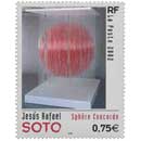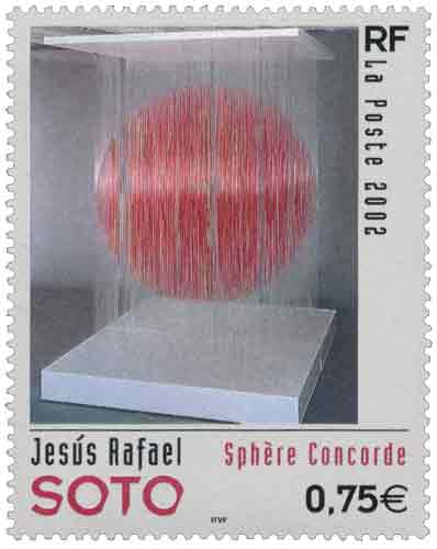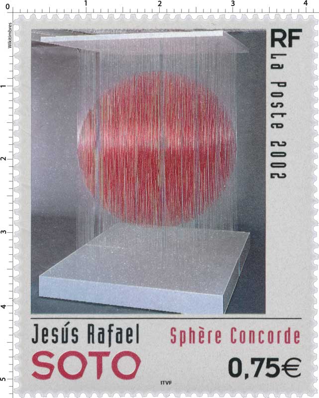 | Commentaire | Description synthétique du visuel du timbre : Jesús Rafael Soto naît en 1923 à Ciudad Bolivar, au Venezuela et s’installe à Paris en 1950. Peintre et sculpteur, il est d’abord influencé par le cubisme. Il sent le besoin de se détacher des formes et de leurs rapports plastiques, pour s’ouvrir au domaine des idées, de l’espace et du temps. Il participe au lancement du mouvement cinétique et expérimente les illusions d’optique, les déformations de lignes obliques coupant des parallèles et sollicite les spectateurs pour en accentuer le dynamisme. Son but : donner des preuves de la relativité de la vision, tendre vers la connaissance sensible de l’immatériel. L’œuvre qui illustre le timbre a été réalisée en 1996. Constituée de panneaux de bois peint, de fils de nylon et d’aluminium, elle mesure 257 x 184 x 184 cm. |