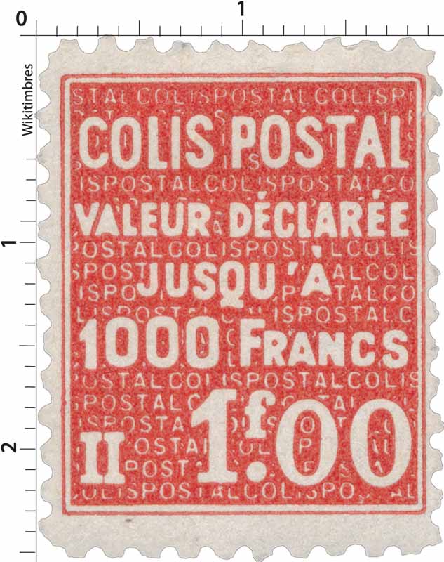 Timbre : 1939 COLIS POSTAL VALEUR DÉCLARÉE Jusqu'à 1000 francs Mesures Format d'imp 18 x 22 mm Dents incluses 20 x 24 mm Forme vertical Phosphore Non Impression Typographie Complément xxxxx Couleur rouge Valeur 1f00 Dentelure 11 Emis en - Quantité - Auteurs Dessinateur xxxxx Graveur xxxxx Mise en page xxxxx Mentions - Numéros & Dates N° Philatelix CP159 N° Michel - Date d'émission 01/01/1939 Date de retrait - Classements Groupe Colis postaux 1939 Catégorie Colis postaux Familles Usage - Régions - Départements - Description Colis postaux Commentaire - Mes timbres & notes personnelles www.wikitimbres.fr
