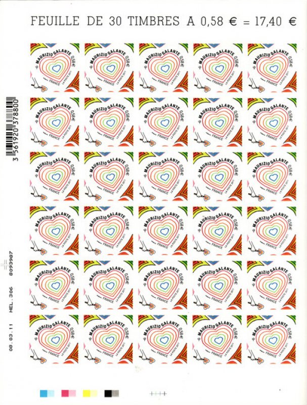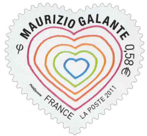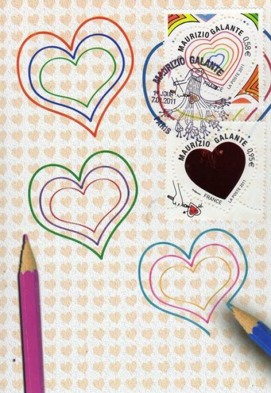 | Commentaire | Existe également sur papier gommé. Maurizio Galante a créé 2 timbres audacieux pour illustrer les cœurs griffés 2011. Le timbre à 0,58 € est à colorier à sa guise. C’est un appel à la créativité, chacun devenant l’auteur de son timbre. Timbre à date “Premier Jour” conçu par Maurizio Galante |