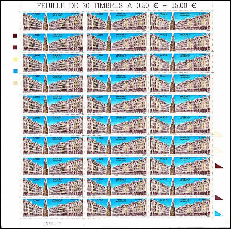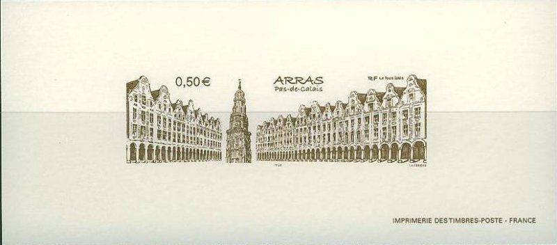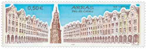 | Commentaire | Existe non surchargé accidentellement de bandes phosphorescentes. Description synthétique du visuel du timbre : Arras, chef lieu du Pas-de-Calais, est au carrefour de la tradition et de la modernité. Cette ville chargée d’art et d’histoire présente en particulier deux places pittoresques, dont la Grande Place illustrant le timbre, avec ses maisons à arcades de style Renaissance flamande du XVIIe siècle, aux façades rehaussées de pignons arrondies. Le beffroi, surmonté du lion d’Arras, complète le visuel. |