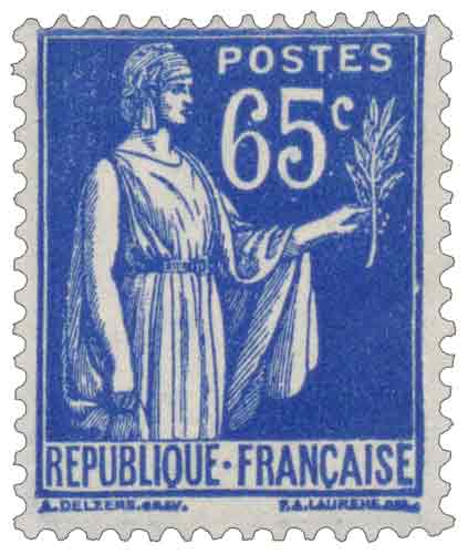 | Commentaire | Paix de Laurens. Type I. Émis en septembre 1937, ce timbre outremer fait partie de la troisième série du "Type Paix de Laurens", un dessin symbolique de l'entre-deux-guerres. Créé par Paul-Albert Laurens (dessin) et gravé par Antonin Delzers, ce type vertical était imprimé en typographie sur des feuilles de 100, et fait la particularité d'avoir également été émis en bandes pour roulettes, facilitant la distribution dans les bureaux de poste. D'une valeur faciale de 65 centimes, il correspondait au tarif de l'affranchissement de la lettre simple pour l'intérieur jusqu'en juillet 1937, faisant de lui une valeur d'usage très courant. Malgré l'absence des chiffres de tirage et de vente, son rôle central dans le courrier quotidien assure une large diffusion. Ce timbre a eu une durée de vie relativement longue, étant retiré de la vente le 28 décembre 1940. |
