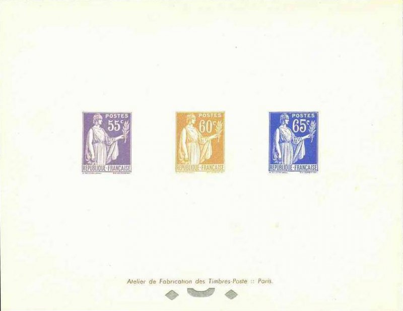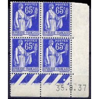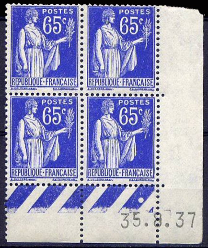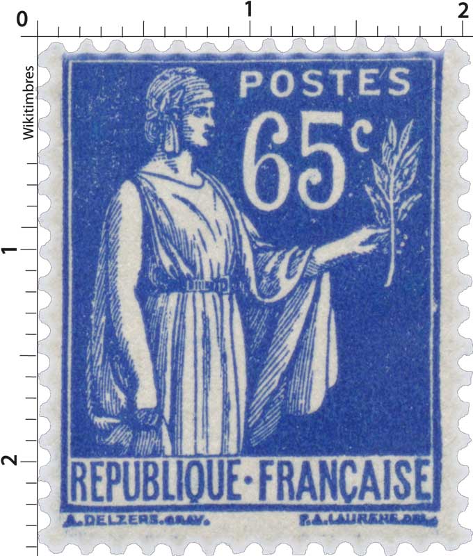 | Commentaire | Paix de Laurens. Type I. Émis en septembre 1937, ce timbre outremer fait partie de la troisième série du "Type Paix de Laurens", un dessin symbolique de l'entre-deux-guerres. Créé par Paul-Albert Laurens (dessin) et gravé par Antonin Delzers, ce type vertical était imprimé en typographie sur des feuilles de 100, et fait la particularité d'avoir également été émis en bandes pour roulettes, facilitant la distribution dans les bureaux de poste. D'une valeur faciale de 65 centimes, il correspondait au tarif de l'affranchissement de la lettre simple pour l'intérieur jusqu'en juillet 1937, faisant de lui une valeur d'usage très courant. Malgré l'absence des chiffres de tirage et de vente, son rôle central dans le courrier quotidien assure une large diffusion. Ce timbre a eu une durée de vie relativement longue, étant retiré de la vente le 28 décembre 1940. |